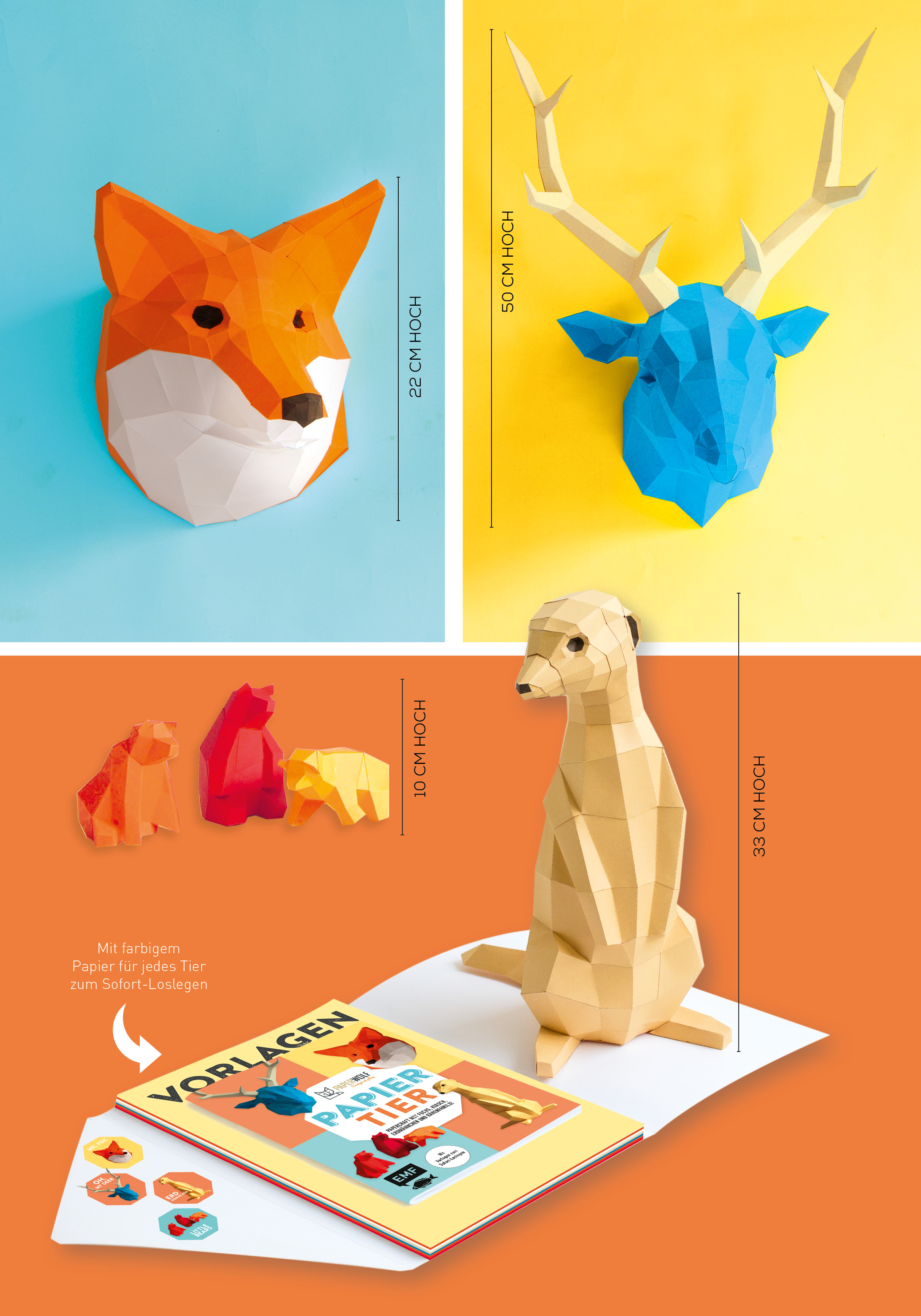 Mit diesem Set holen Sie sich coole Papierskulpturen und tierischen Faltspaß in die eigenen vier Wände. Legen Sie dank der beiliegenden durchgefärbten Papierbogen mit aufgedruckter Vorlage direkt los und erwecken Sie so Fuchs, Hirsch, Erdmännchen und Bärenfamilie zum Leben. Dank der bebilderten Faltanleitungen in "PAPIERtier" finden auch Einsteiger den optimalen Einstieg in das Falten und Zusammenkleben der niedlichen Papiertiere. Bastelspaß und Designobjekt in einem - ausschneiden, falten, kleben, fertig!