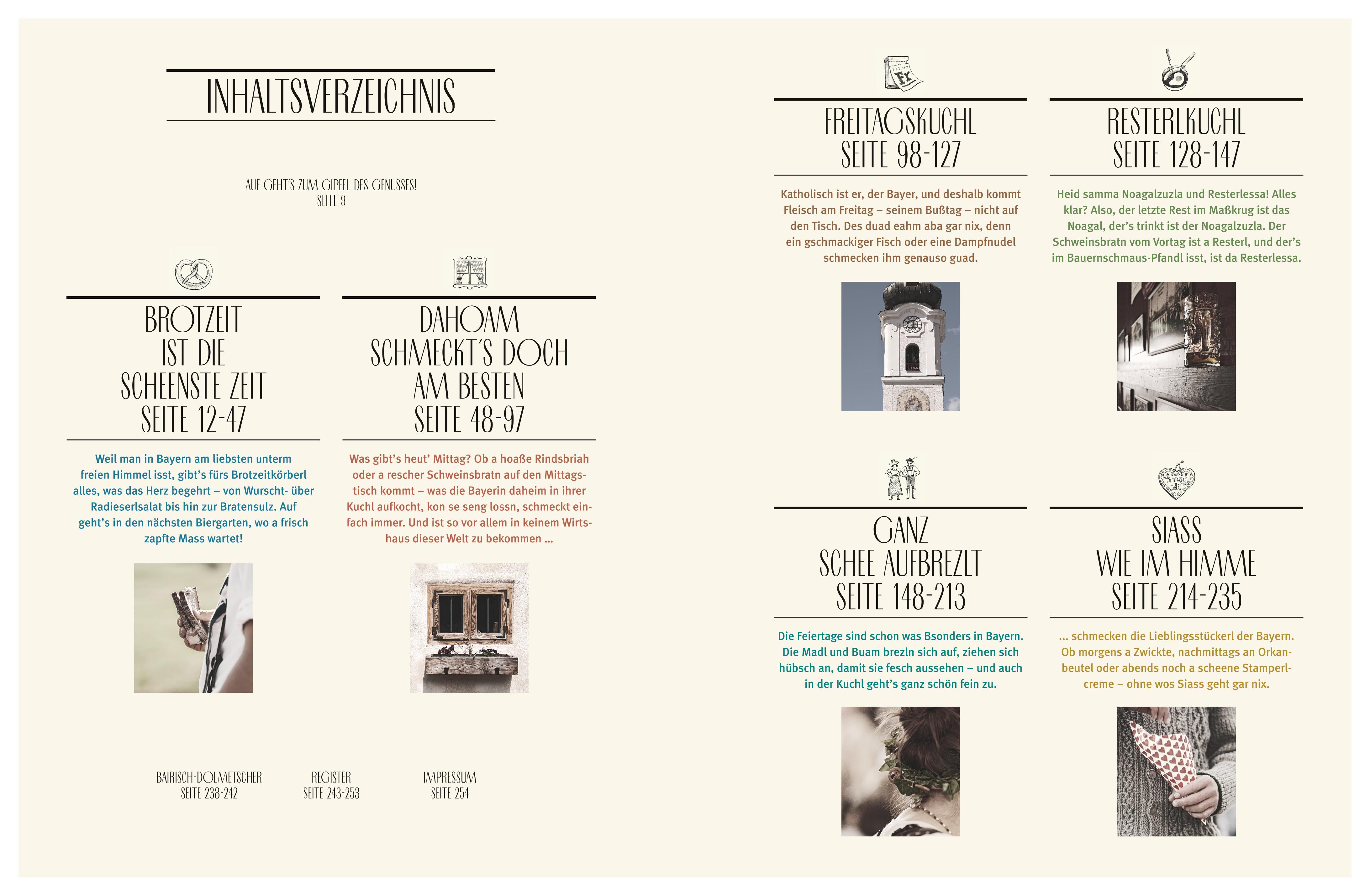 Berge, Seen, Kuhglocken, Dirndl, Gamsbart und dann no a Maß Bier und a resche Brezn unterm weiß-blauen Himme - mei is des sche! Urig und ein wenig grantlig sind sie, die Bayern und doch oder gerade deshalb lieben sie alle. Und weil er gerne isst, der Bayer und das am liebsten unter freiem Himmel, gibt es von Wurst- über Radieserlsalat bis hin zur Bratensulz alles, was das Herz im Biergarten begehrt. Alle bayerischen Schmankerl sind nach Anlässen und Orten, an denen der Bayer am liebsten isst, gegliedert. So etwa die Freitagskuchl, bei der beim eingefleischten Bayern ausnahmsweise kein Fleisch auf den Teller kommt. Macht aber gar nix, denn so a Dampfnudel mit Krusterl schmeckt himmlisch. Und auch Traditionelles wie das Maibaumaufstellen, der Almabtrieb, die Kirchweih und so manches Volksfest bieten viele bayerische Schmankerl - optisch und kulinarisch. Bayern ist einfach Kult! Vor allem, wenn heimisches Brauchtum frisch aufgeputzt fast schon a bisserl Exotik ausstrahlt.