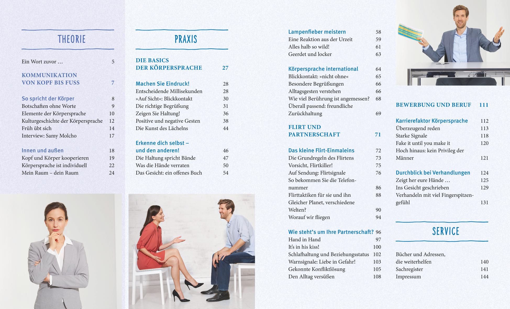Hinweis zur OptimierungImpressumKörperspracheMonika MatschnigBotschaften des KörpersKommunikation von Kopf bis FussDie Basics der KörperspracheFlirt und PartnerschaftBewerbung und BerufAdressen, die weiterhelfenBücher, die weiterhelfen»Nett, mit dir zu plaudern!«Erfolgreiche Gesprächsführung: acht goldene RegelnDie Autorin