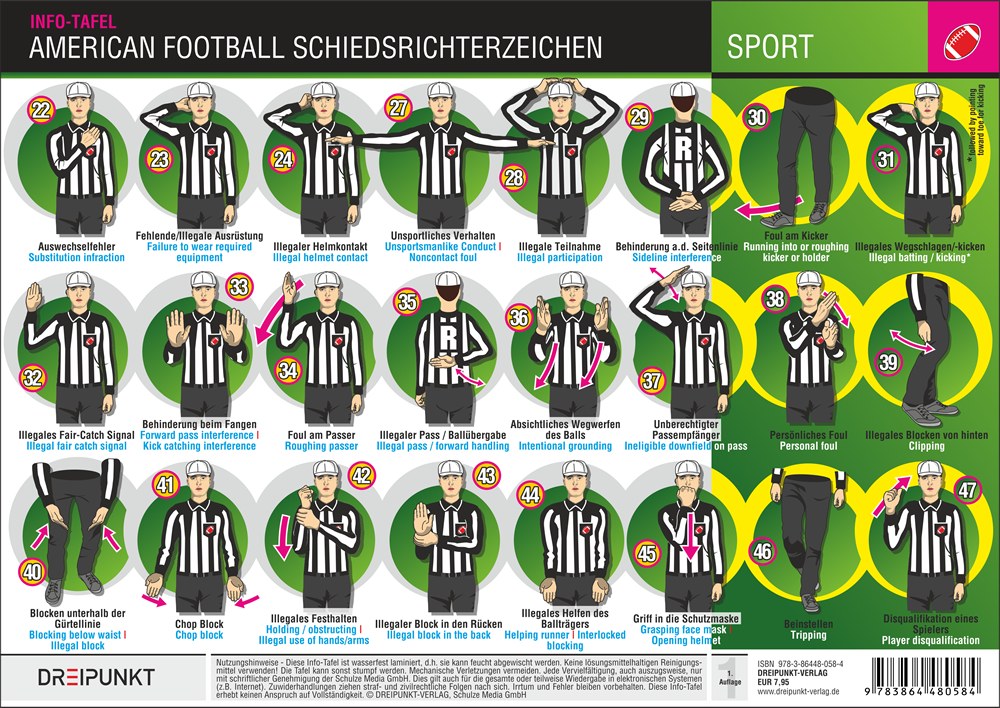 | Schlagworte | aktualisiert • American Football • Ball • Dreipunkt • Dreipunkt-Verlag • Football • Info-Tafel • Lernen • Mannschaftssport • Schiedrichterzeichen • Schiedsrichter • Schiedsrichterzeichen • Schiedsrichter Zeichen • Schieri • Schierizeichen • schiri • Schirizeichen • Spiel • Spielen • Sport • Zeichen |