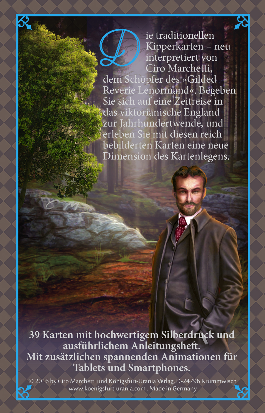Marchetti, CiroCiro Marchetti ist ein englischer Grafic Artist, der mit David Bowiein die Schule ging und heute in Florida / USA lebt. Sein besonderesFaible gilt der Animation von Traum- und Orakelwelten. Sein Kartendeck"Gilded Reverie Lenormand" ist ein internationaler Bestseller,mit mehr als 20.000 verkauften Exemplaren im deutschsprachigenRaum.