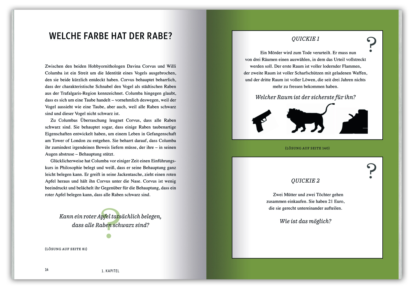 logisches Denken. Welche Farbe also hat der Rabe? Nicht zwingend schwarz, weil es rote Äpfel gibt, logisch! Es gibt Fragen, über die sich selbst die Klügsten manchmal schon seit Jahrtausenden ihre Köpfe zerbrechen. Der zweite Band Welche Farbe hat der Rabe?