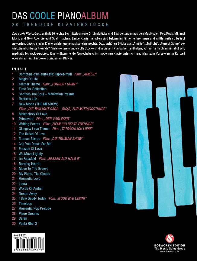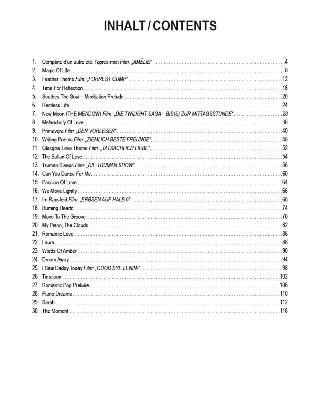 Einige Klaviermelodien sind bekannten Filmen entnommen und mittlerweile so beliebt geworden, dass sie jeder Klavierspieler gerne nachspielen möchte. Dazu gehören Stücke aus Amélie, Twilight, Forrest Gump sowie Ziemlich beste Freunde und natürlich das berühmte Klavierstück River Flows in You von Yiruma. Viele weitere wundervolle Stücke sind in diesem Pianoalbum enthalten, von romantisch, minimalistisch, meditativ bis rockig-poppig.