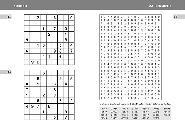 | Schlagworte | Fehlersuche • Gitterrätsel • Kakuro • Knobeln • Kombirätsel • Kreuzworträtsel • Kreuzworträtselbuch • Kreuzworträtselheft • Lifestyle, Hobbys und Freizeit • lösen • Magische Quadrate • Puzzle • Rätsel • Rätselbuch • Rätsel f. Kinder/Jugendliche • Rätselheft • Rätselmix • Rätseln • Schüttelrätsel • Schwedenrätsel • Wabenrätsel • Wörterversteck • Zahlensuche |