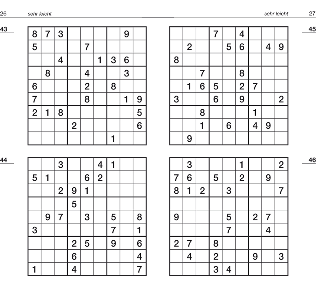 Das aus Japan kommende Rätsel Sudoku besteht aus neun quadratischen 3 x 3-Blöcken, wobei jeder quadratische Block in drei Reihen mit jeweils drei Kästchen unterteilt ist. In jedem quadratischen 3 x 3-Block sind Zahlen zwischen 1 und 9 vorgegeben. Diese vorgegebenen Zahlen gilt es so zu ergänzen, dass jede Zahl zwischen 1 und 9 nur einmal vorkommt. Auch in den neun Spalten und neun Zeilen des gesamten Sudoku-Rätsels dürfen die Zahlen von 1 bis 9 nur einmal vorkommen.Die Sudoku-Rätsel sind in die Schwierigkeitsstufen sehr leicht, leicht, mittelschwer, schwer und sehr schwer eingeteilt.