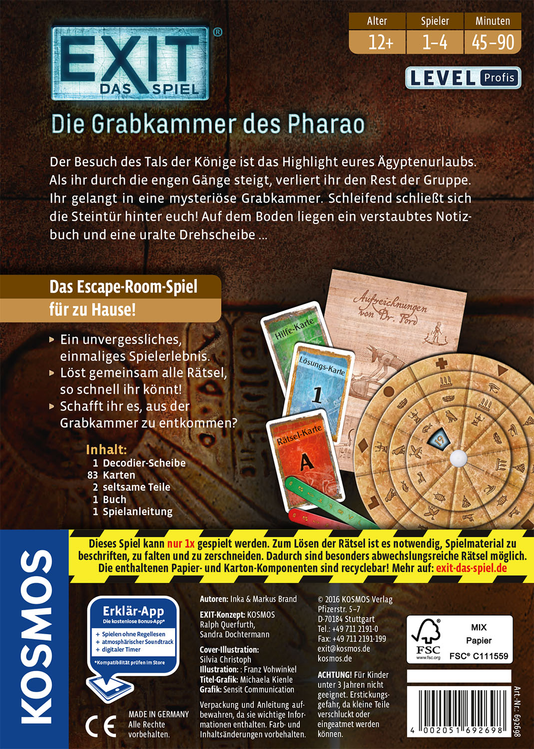 Aus der erfolgreichen Spielereihe "EXIT® - Das Spiel". Das Escape-Room-Spiel für zu Hause. Könnt ihr die Rätsel lösen und aus das Geheimnis des Pharaos lüften? 1-4 SpielerInnen lösen im Team clevere Rätsel und brauchen dazu Teamgeist, Kreativität und Kombinationsgeschick. Kooperatives Erlebnisspiel im Profi-Level. Mit Tutorial und Timer in der kostenlosen KOSMOS-Erklär-App. Mit und ohne App spielbar. Gesellschaftsspiel für Erwachsene, Fans von Live Escape Rooms und Familien ab 12 Jahren. Ideal als Partyspiel, Eventspiel und als Geburtstagsgeschenk. Da die Materialien für die außergewöhnlichen Rätsel verändert werden, nur einmal spielbar! Während eines Ägypten-Urlaubs besucht ihr das Highlight eures Aufenthalts - die steinernen Pyramiden! Doch als ihr durch die engen, labyrinthartigen Gänge steigt, verliert ihr schnell den Rest der Gruppe. Nach langem Umherirren gelangt ihr schließlich in eine mysteriöse Grabkammer. Plötzlich schließt sich die Steintür. Ihr seid gefangen. Auf dem Boden liegt ein halb mit Sand verdecktes Notizbuch sowie eine uralte Drehscheibe. Werdet ihr rechtzeitig entkommen oder für immer unter Stein begraben sein? Mit der Reihe "EXIT® - Das Spiel" bringt KOSMOS das Gefühl der Live-Escape-Rooms zu euch nach Hause. Jede Box bietet einer Gruppe von 1 bis 4 Personen ein außergewöhnliches Spielerlebnis für einen einmaligen und absolut unvergesslichen Abend! Der Wettlauf gegen die Zeit und die cleveren Rätsel dieser innovativen Spielreihe sorgen für Spannung und geistige Herausforderung in den eigenen vier Wänden. Um die Rätsel zu lösen und sich somit gemeinsam aus der misslichen Lage zu befreien ist Teamgeist gefragt! Also arbeitet gut zusammen, denn die Zeit läuft... Live-Escape-Feeling im Profi-Level.Inhalt: 1 Buch, 1 Decodier-Scheibe, 23 Rätsel-Karten, 30 Lösungs-Karten, 33 Hilfe-Karten, 2 seltsame Teile, 1 Spielanleitung