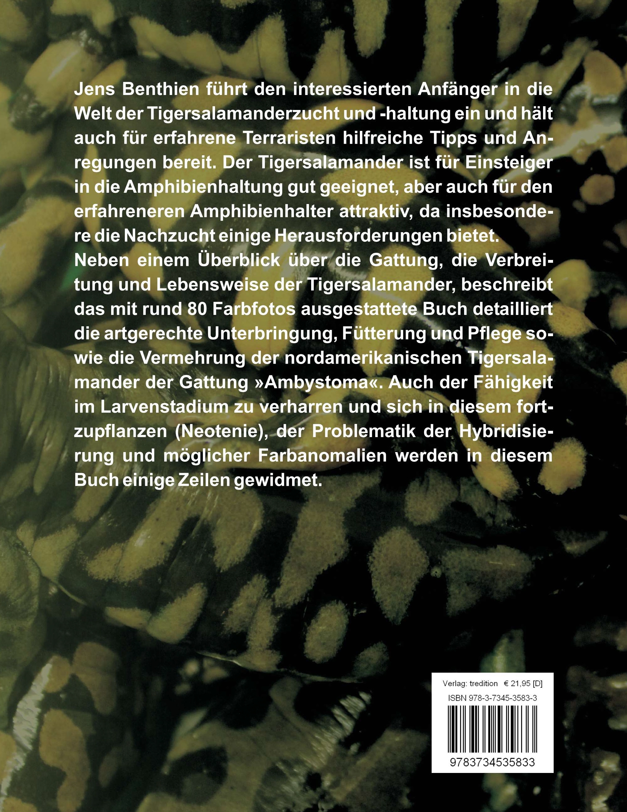 Jens Benthien führt den interessierten Anfänger in die Welt der Tigersalamanderzucht und -haltung ein und hält auch für erfahrene Terraristen hilfreiche Tipps und Anregungen bereit. Der Tigersalamander ist für Einsteiger in die Amphibienhaltung gut geeignet, aber auch für den erfahreneren Amphibienhalter attraktiv, da insbesondere die Nachzucht einige Herausforderungen bietet.