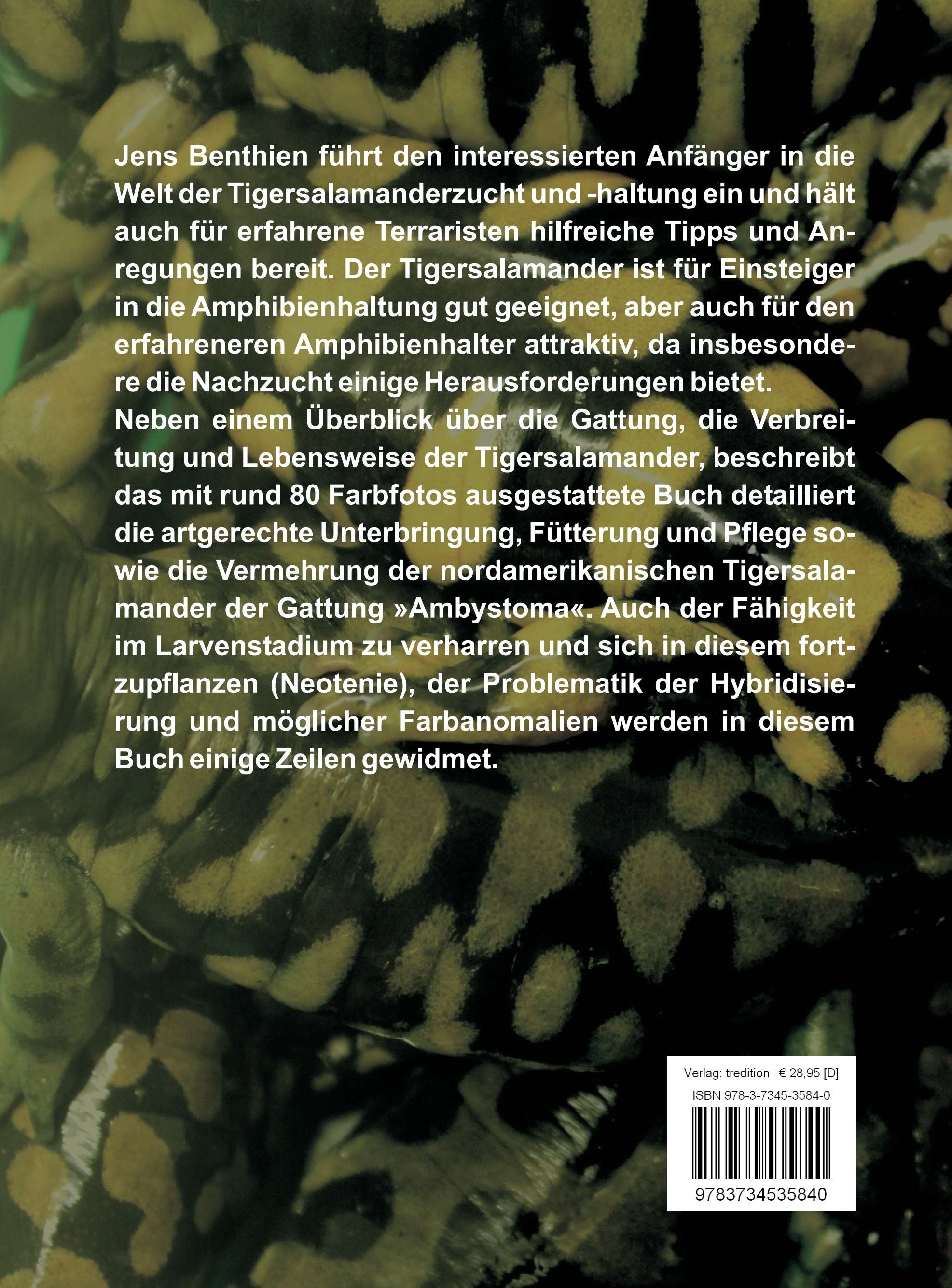 Jens Benthien führt den interessierten Anfänger in die Welt der Tigersalamanderzucht und -haltung ein und hält auch für erfahrene Terraristen hilfreiche Tipps und Anregungen bereit. Der Tigersalamander ist für Einsteiger in die Amphibienhaltung gut geeignet, aber auch für den erfahreneren Amphibienhalter attraktiv, da insbesondere die Nachzucht einige Herausforderungen bietet. Neben einem Überblick über die Gattung, die Verbreitung und Lebensweise der Tigersalamander, beschreibt das mit rund 80 Farbfotos ausgestattete Buch detailliert die artgerechte Unterbringung, Fütterung und Pflege sowie die Vermehrung der nordamerikanischen Tigersalamander der Gattung »Ambystoma«. Auch der Fähigkeit im Larvenstadium zu verharren und sich in diesem fortzupflanzen (Neotenie), der Problematik der Hybridisierung und möglicher Farbanomalien werden in diesem Buch einige Zeilen gewidmet.