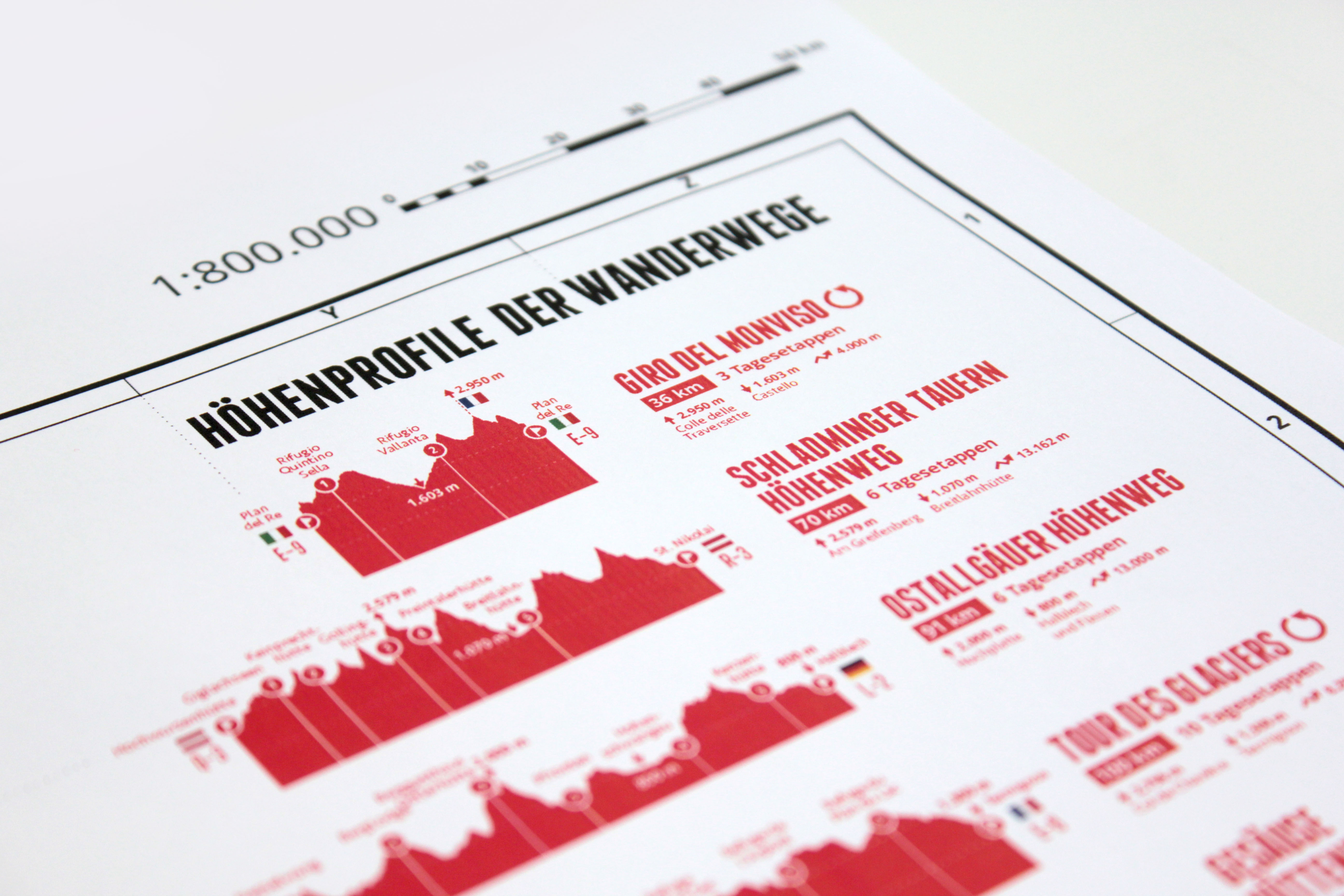20 besondere Wanderwege in den Alpen vervollständigen die Karte. Zur Auswahl der Wege haben wir uns an Beliebtheit, regionaler Verteilung und der Streckenlänge orientiert, um eine große Bandbreite an Wanderwegen darzustellen. Zu allen 20 Wanderwegen wird ein detailliertes Höhenprofil der Strecke angegeben.
