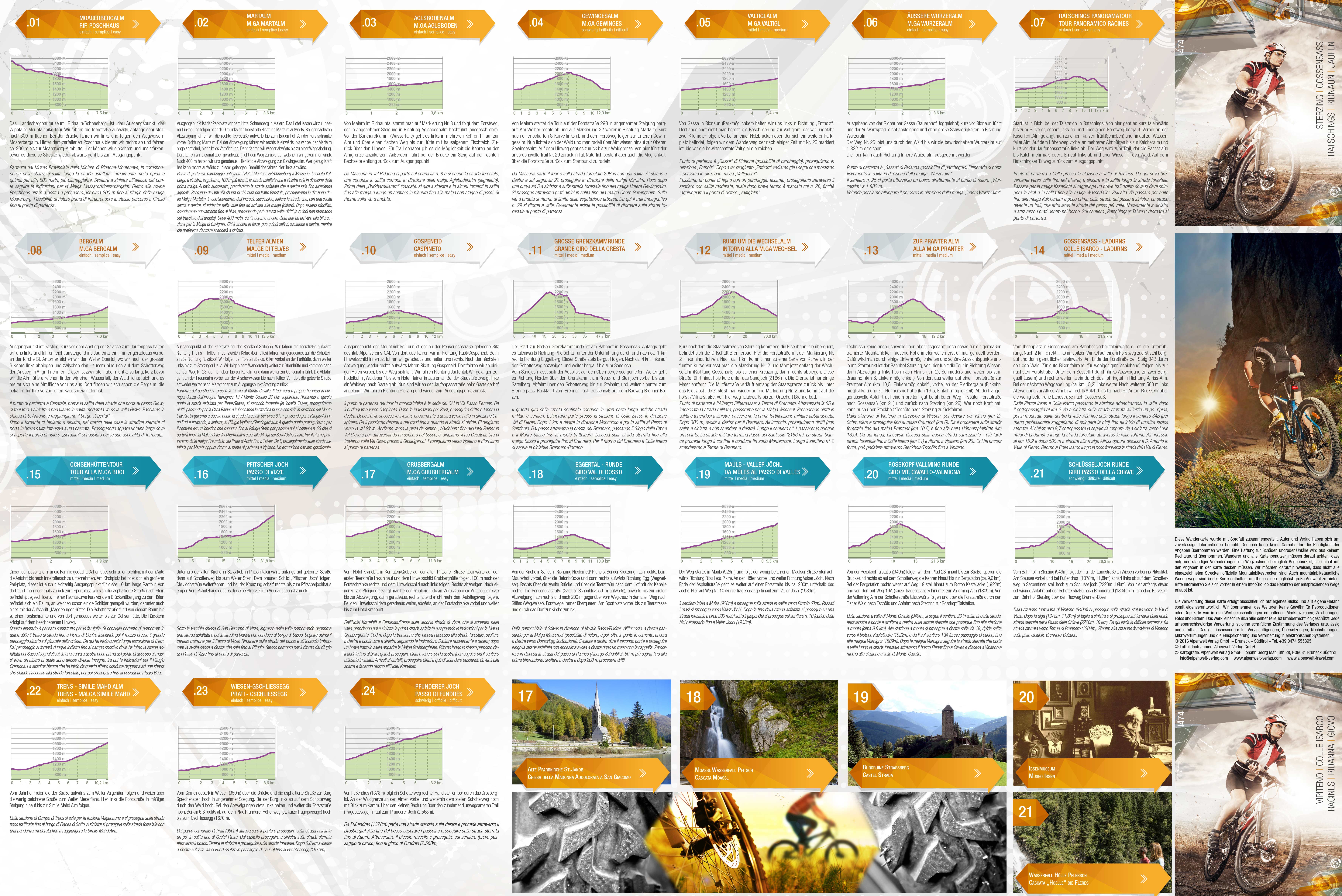 MTB-Karte von Sterzing, Ridnaun, Ratschings, spritzwassergeschützt durch Plastifizierung. MTB-Strecken unterteilt nach Schwierigkeit, allesamt mit Untergrundbeschaffenheit, Tourenbeschreibungen mit Höhenprofilen ausgesuchter Touren direkt auf der Karte.