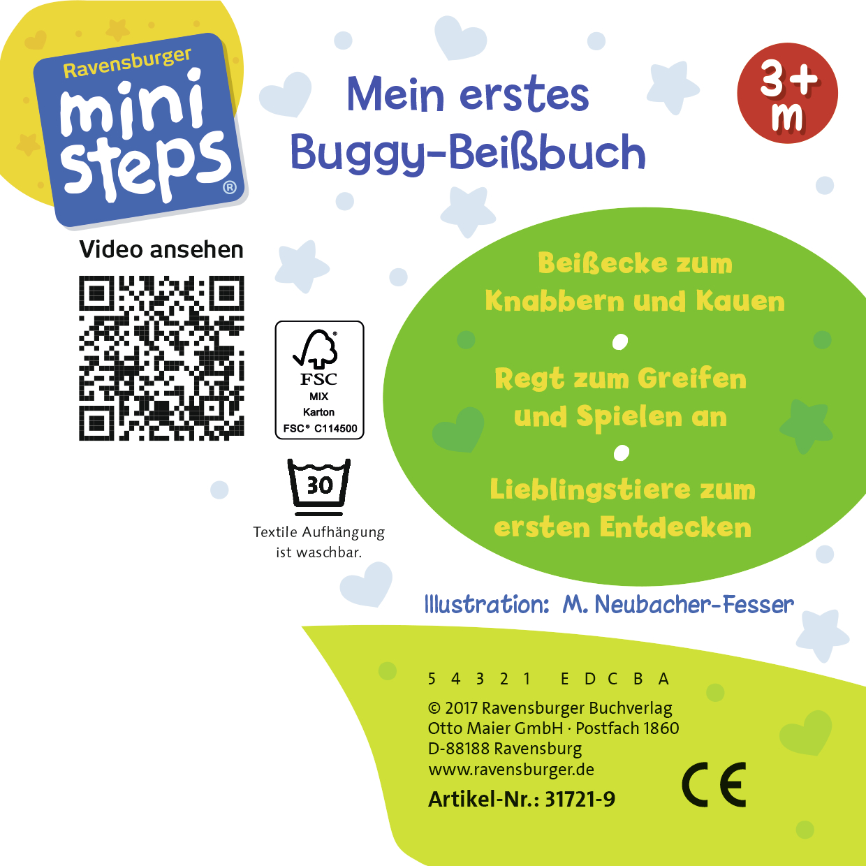Hier gibt es die Lieblingstiere der Kleinen zu entdecken. Die Beißecke aus Kunststoff lädt zum Fühlen und Knabbern ein. Mit Hilfe der waschbaren Aufhängung kann das Buch einfach und sicher an Buggy, Babyschale oder Bettchen befestigt werden.