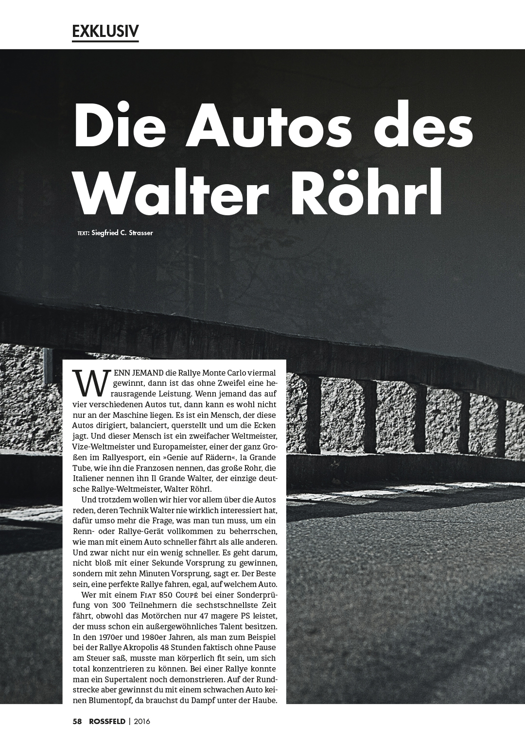 In der ersten Ausgabe können wir unter anderem mit einem packenden Bericht über das Duell zwischen Porsche-Legende Gerhard Mitter und Lodovico Scarfiotti 1966 am Roßfeld sowie mit einem Exklusivbericht über den Botschafter des "Internationalen Edelweiß Bergpreis Roßfeld Berchtesgaden", Walter Röhrl, aufwarten. Unser Autor und Motorsporthistoriker Dr. Siegfried C. Strasser hat keine Mühen gescheut, den "Meister des kontrollierten Drifts" über seine fahrbaren Untersätze, von denen ein großer Teil dieses Jahr am Roßfeld zu bestaunen ist, zu interviewen.