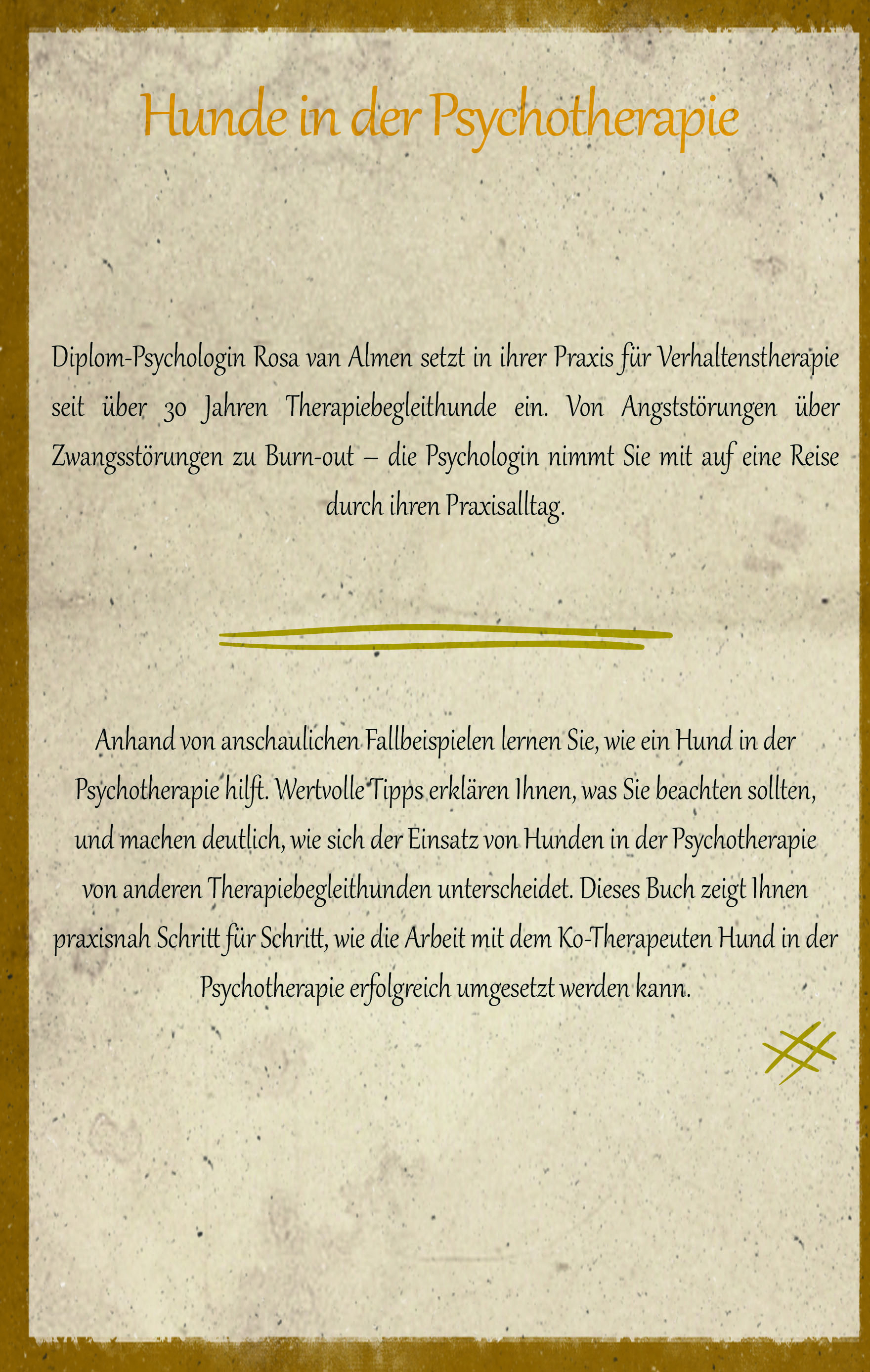 Rosa van Almen, Jahrgang 1951, arbeitet als Verhaltenstherapeutin seit über dreißig Jahren in eigener Praxis mit dem Schwerpunkt „lösungsorientierte Verhaltenstherapie“. Sie ist Diplom-Psychologin und besitzt einen zweiten Universitätsabschluss als Magister Artium in den Fächern Pädagogik, Kommunikationswissenschaften und Psychologie. Ihre Behandlungsschwerpunkte sind Anpassungsstörungen, Ängste, Depressionen, Burn-out, Lebenskrisen (Beruf, Ehe, Familie), Schlafstörungen, Schmerztherapie und Somatisierungstörungen. Zu ihren weiteren Schwerpunkten zählen Bewegungs- und Sporttherapie, Coaching und Personalberatung, Entspannungstherapie (Atementspannung, Autogenes Training, Progressive Muskelrelaxation nach Jacobson, meditative Techniken), Hypnose, Tiergestützte Psychotherapie, Trauer- und Sterbebegleitung. Im „Praxisteam“ von Frau van Almen befinden sich seit über 30 Jahren von ihr selbst ausgebildete Therapiebegleithunde. Zu Beginn ihrer Praxistätigkeit besaß sie auch ein Therapiepferd, das sie speziell bei Kindern zum Einsatz brachte.