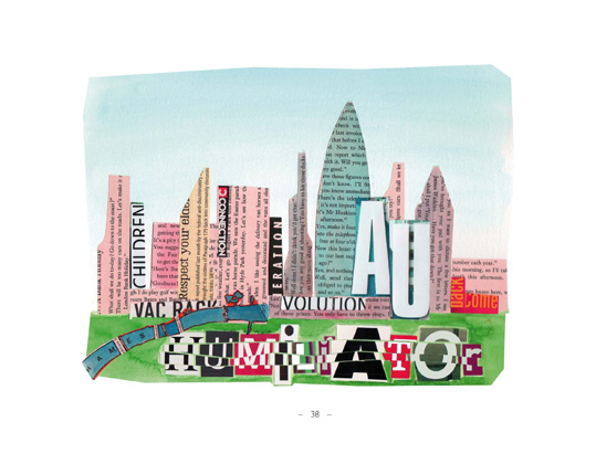 Das Buch ist reich illustriert von Marion Stelter, die mit ihren Bildcollagen, bestehend aus einfachen gegenständlichen Formen in Verbindung mit einprägsamen Worten, die 13 Stationen künstlerisch begleitet. In orangefarbenes Leinen gebunden und leuchtend blau beschriftet ist das Buch sehr edel und ansprechend gestaltet. Die Rede ist zweisprachig, in Englisch und Deutsch gedruckt.