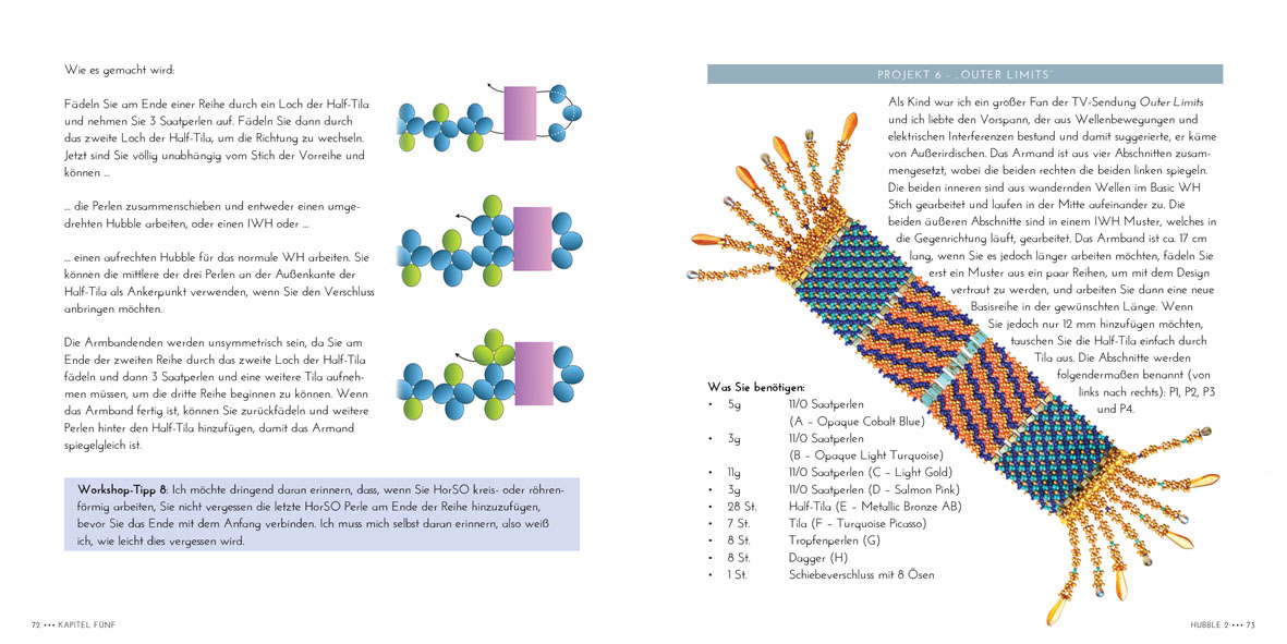 Warnung - dieses Buch platzt vor lauter Ideen!Ihre Füße werden den Boden kaum berühren, wenn Melanie Sie zu einem tollen Perlenabenteuer in das Reich des Hubble Stichs entführt.Als Nachfolger von "Hubble!" bringt Sie "Hubble 2" in neue Perlenhöhen und lässt Sie den Sprung vom Hubble zum Wave Hubble Stich, der neuen, aufregenden Technik machen.Sie werden auf eine Entdeckungsreise mitgenommen und Melanie leitet Sie mit ihrer Art des Unterrichtens durch die vielen verschiedenen Formen des Wave Hubble. Den leicht zu folgenden Grafiken nach geht es vom Basic Wave Hubble bis hin zu komplexen dreidimensionalen Formen.Mit Basic Wave Hubble fädeln Sie tolle, spitzenartige Perlenarbeiten in aufregenden Mustern und einer wundervoll weichen, seidenartigen Qualität. Bei dreidimensionalen Formen ist das Perlengewebe flexibel wie ein Seil und als Ring können Sie die Technik für Verschlüsse verwenden. Arbeiten Sie sich durch die neun schönen und innovativen Projekte, die Melanie für Sie entworfen hat und lernen Sie dabei alle Aspekte des Wave Hubble kennen - von einfachen Armbändern über Bilder und Selfies bis hin zu eingefassten Rivoli und Knebelverschlüssen!Das Buch enthält:- Schritt-für-Schritt Anleitungen und klare Grafiken- Praktische und hilfreiche Workshop-Tipps- Viele Anregungen für Varianten- Ideen, wie Sie den Stich für Ihre eigenen Designs adaptieren können- Tolle und inspirierende Vollfarbfotos