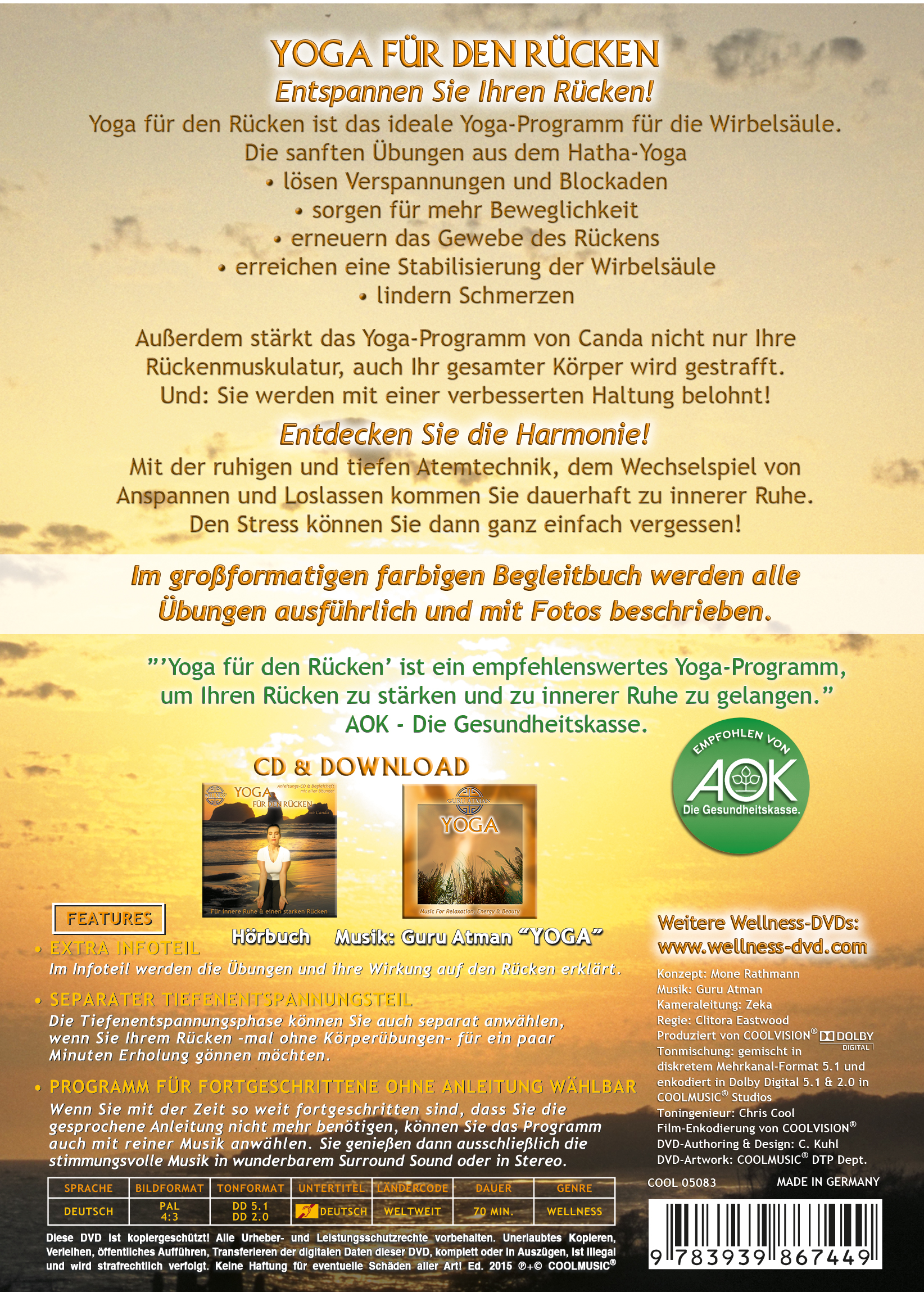 Entspannen Sie Ihre Wirbelsäule mit "Yoga für den Rücken" im limitierten Box-Set mit DVD und Begleitbuch und lernen Sie rückengerechtes Yoga mit Canda kennen. "Rückengerecht" bedeutet, dass alle Yogaübungen in dieser Yoga-Technik den Rücken stabilisieren oder entlasten und dabei die meditative Wirkung des Yogas entfalten. Candas Yoga-Programm fällt unter den Begriff des Hatha-Yoga, das ist das Yoga der Ausgeglichenheit. Dabei sind nicht nur Körperhaltung, sondern auch Atmung von entscheidender Bedeutung. Mit der ruhigen und tiefen Atemtechnik, dem Wechselspiel von Anspannen und Loslassen kommen Sie dauerhaft zu innerer Ruhe. Den Stress können Sie dann ganz einfach vergessen!