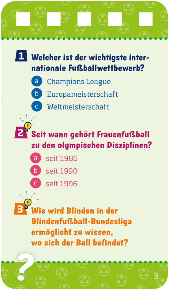 | Schlagworte | Bundesliga • Deutsch • EM • Fußball • Fußball; Kindersachbuch/Jugendsachbuch • Geschichte • Kinder • Kindergeschenkbücher • Kinder/Jugendliche: Sachbuch: Hobbys, Denksportauf • Quiz • Quizblock • Quiz f. Kinder/Jugendliche • Rätsel • Regeln • Sport und Freizeit • Unterhaltung • Wissen • Wissenswertes und Quizfragen • WM |