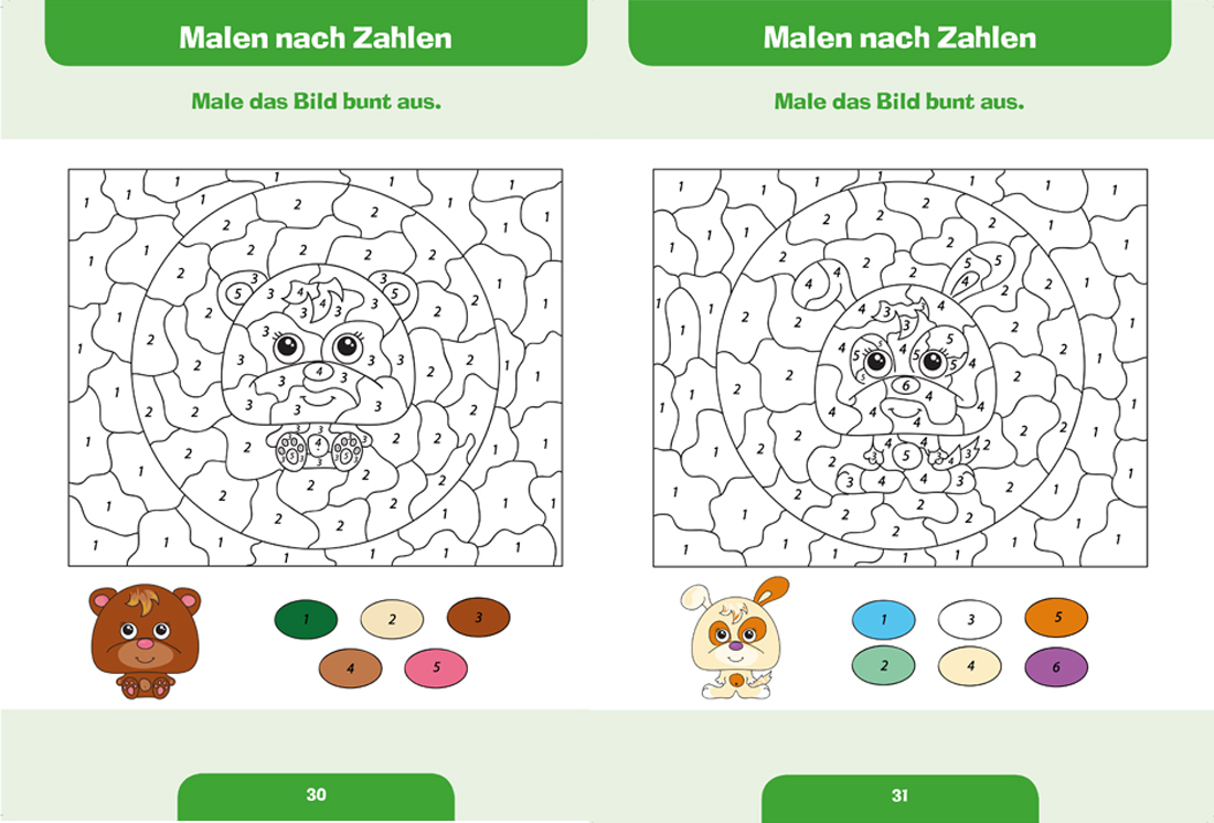 Ob lieblicher Panda oder frecher Pinguin, ob wilder Stier oder scheues Reh, ob rauchender Vulkan oder leckere Pizza: Beim Malen nach Zahlen führen die nummerierten Ausmalfelder und der Zahlenschlüssel für die einzelnen Farben zu einer Fülle bunter Bilder, die Spaß und Freude machen, keine Langeweile aufkommen lassen und ganz nebenbei auch noch dazu beitragen, auf spielerische Weise den Umgang mit Farben, Formen und Zahlen zu fördern.