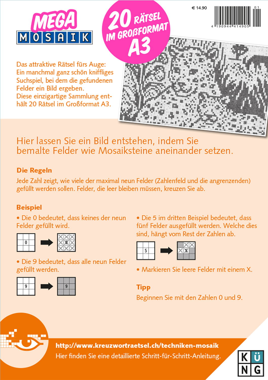 Mosaik ist ein beliebtes Bilderrätsel, das bereits als Taschenbuch und grosses Rätselbuch erhältlich ist. Sie wissen: Die Zahlen im Raster geben an, welche Flächen ausgemalt werden müssen. Je grösser das Rätsel, desto anspruchsvoller. Hier bieten wir 20 Mega-Mosaik-Rätsel im Überformat A3! Diese Vorlagen haben es in sich und richten sich an Mosaik-Fans, die die Herausforderung lieben. Die 20 Rätsel sind als lose Doppelseiten in einer A4-Mappe verpackt. Also praktisch zum Herausnehmen und Rätseln. Hier die genauen Größen der 20 Rätsel: 15 Rätsel 100 x 60 Felder (Querformat); 5 Rätsel 60 x 100 Felder (Hochformat). English instruction enclosed.