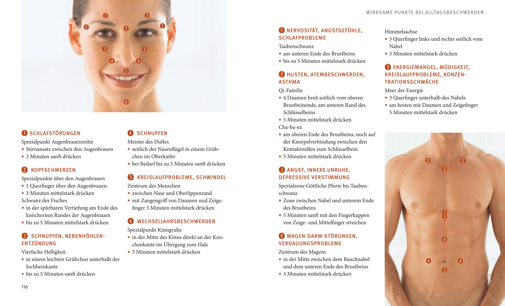 Selbst Ungeübte finden mit Hilfe der genauen Anleitungsfotos und Beschreibungen schnell und sicher die heilsamen Massagepunkte. Ergänzt wird dies durch Behandlungsregeln, Angaben zu Dauer und Intensität der Akupressur sowie Möglichkeiten und Grenzen der Selbstbehandlung. Daneben schenken drei Kurzprogramme je nach Bedarf mehr Energie oder Ruhe in den Alltag.