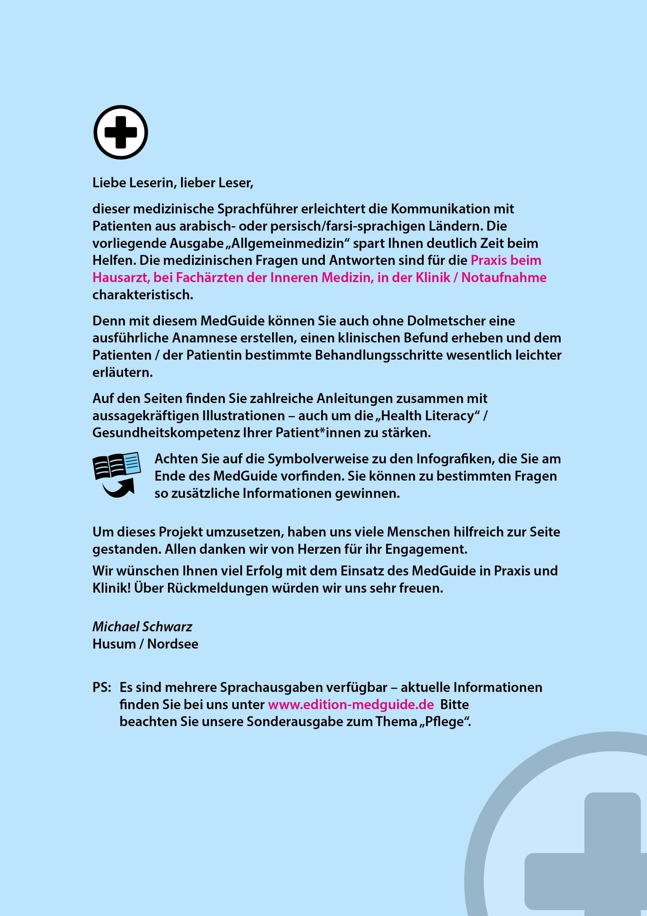 Die Fragen und Antworten decken fast jeden Gesundheitsaspekt auf Deutsch, Arabisch und Farsi ab. Auf 100 Seiten finden sich zahlreiche Anleitungen mit aussagekräftigen Illustrationen, die typisch sind für das Gespräch beim Hausarzt, beim Facharzt der Inneren Medizin und im Krankenhaus auf den Stationen sowie in der Notfallambulanz.