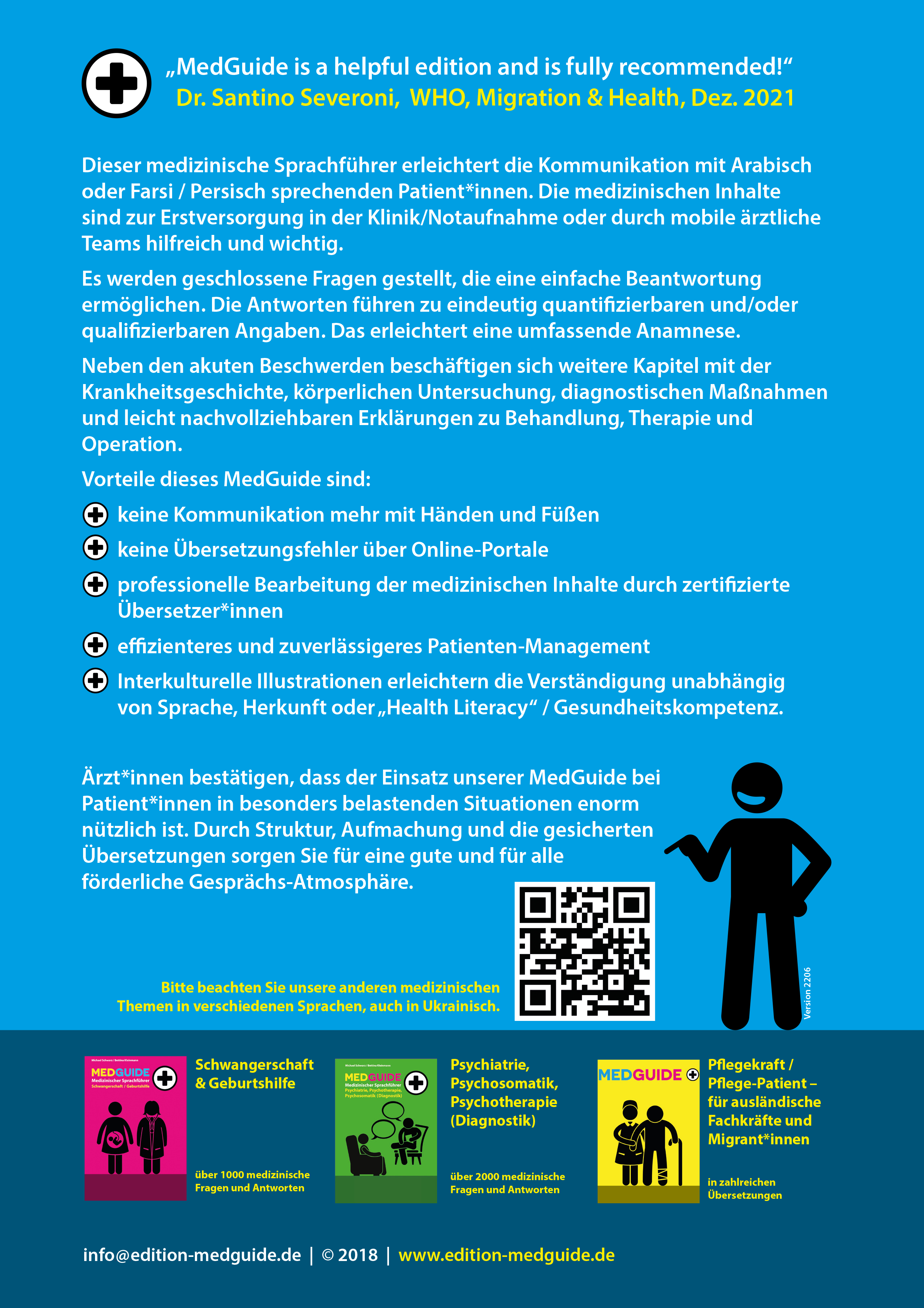 Der MedGuide zur Gesundheit von Flüchtlingen / Menschen mit Migrationshintergrund erleichtert die Kommunikation zwischen Arzt und Patient. Über 500 Fragen und Antworten wurden von einem Ärzte-Team entwickelt und ins Arabische und ins Persische übersetzt.