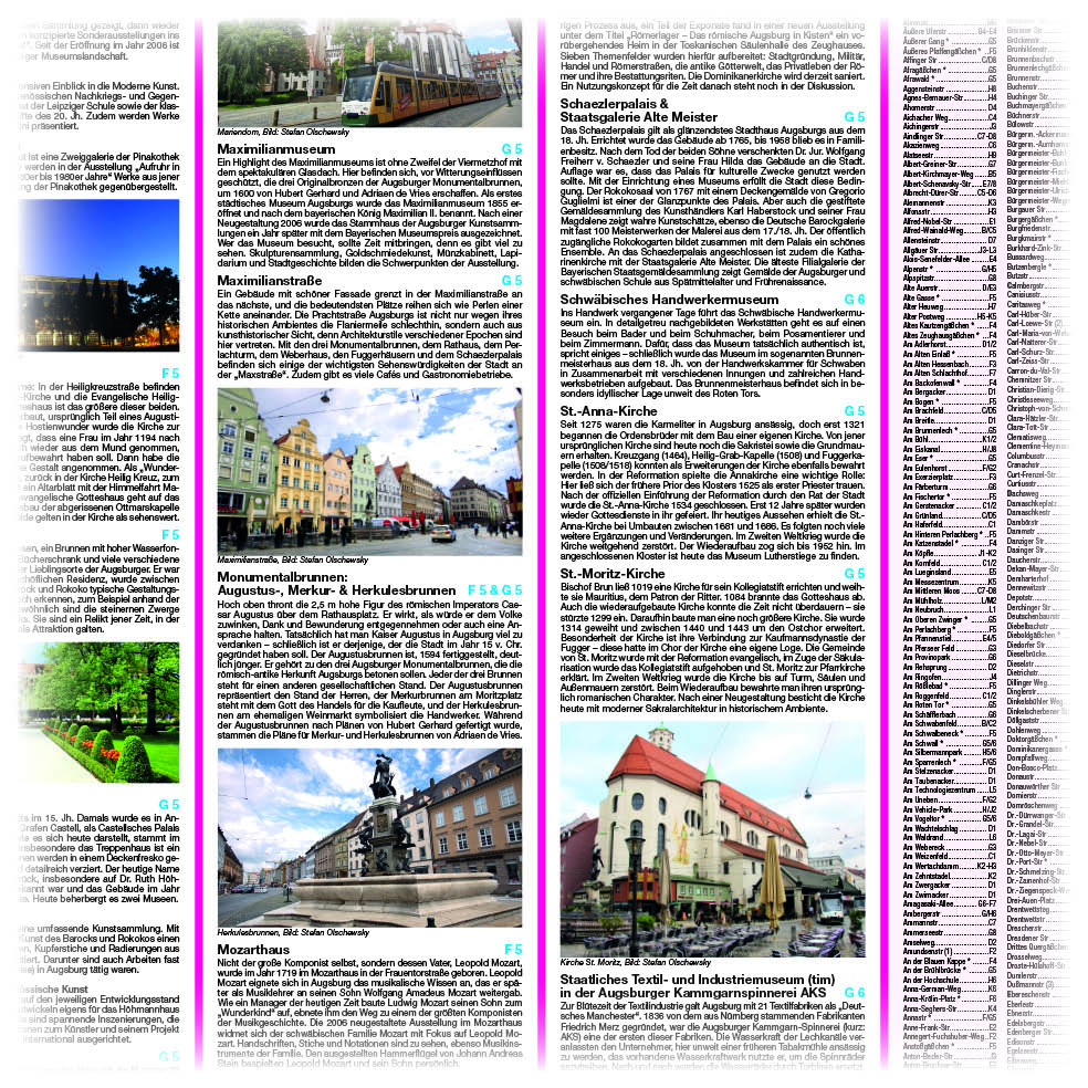 Der touristische Stadtplan enthält alle wichtigen Sehenswürdigkeiten, einen Übersichtsplan rund um Augsburg im Maßstab 1 : 200 000, eine Innenstadtvergrößerung im Maßstab 1:10 000 und ein Straßenverzeichnis zur schnellen Orientierung.
