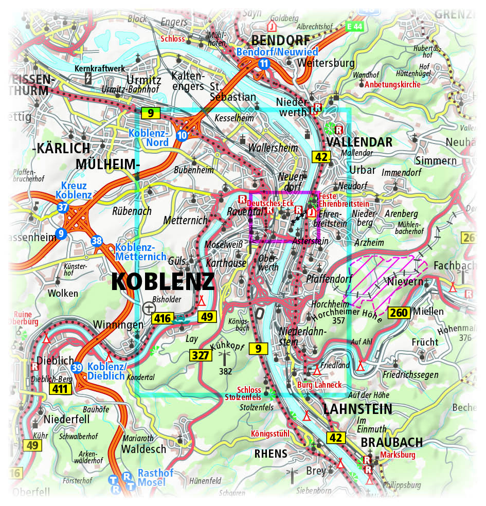 Am bekannten Deutschen Eck, wo sich Rhein und Mosel treffen, liegt eine der schönsten und ältesten deutschen Städte: Koblenz. Zeugnisse hervorragender Baukunst, hübsche Winkel, enge Gassen, moderne Uferpromenaden sowie schön gestaltete Plätze und Fußgängerzonen laden zum Bummeln ein. Neben dem Deutschen Eck mit dem Kaiser-Wilhelm-Denkmal, der Festung Ehrenbreitstein, dem Kurfürstlichen Schloss sowie Schloss Stolzenfels warten auch zahlreiche Museen auf Entdeckung. Das Mittelrhein-Museum, das Ludwig-Museum, das Landesmuseum, das Rhein-Museum und das Romanticum mit seiner interaktiven Erlebnisausstellung, zeigen ihre Sehenswürdigkeiten und dokumentieren die 2.000-jährige Stadtgeschichte. Der touristische Stadtplan ist dabei Ihr zuverlässiger Begleiter. Mit Straßen- und Sehenswürdigkeitenverzeichnis sowie Umgebungsplan und Innenstadtvergrößerung behält man stets die Übersicht.