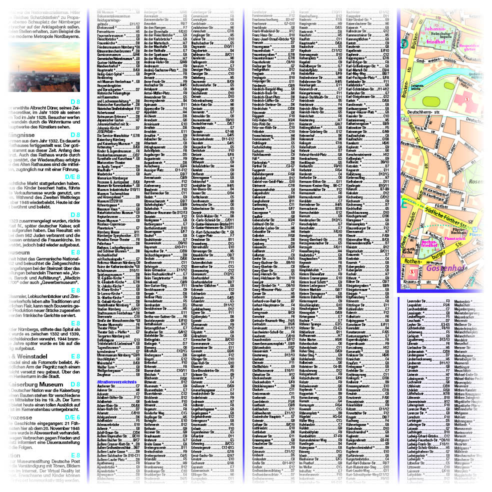 Der reichen Historie, die das ehemals zu den mächtigsten Kaiserstädten des Heiligen Römischen Reiches zählende Nürnberg prägt, begegnet man auf Schritt und Tritt. Nicht nur die Kaiserburg erzählt Geschichte, auch die zahlreichen Museen, das Albrecht-Dürer-Haus oder die Frauenkirche. Ihrem Ruf als Spielzeugstadt wird Nürnberg zum Beispiel im Spielzeugmuseum gerecht und zur Weihnachtszeit ist hier sogar das Christkindle zu finden. Der touristische Innenstadtplan Nürnberg enthält alle wichtigen Sehenswürdigkeiten, eine Innenstadtvergrößerung im Maßstab 1:10 000 und ein Straßenverzeichnis zur schnellen Orientierung.