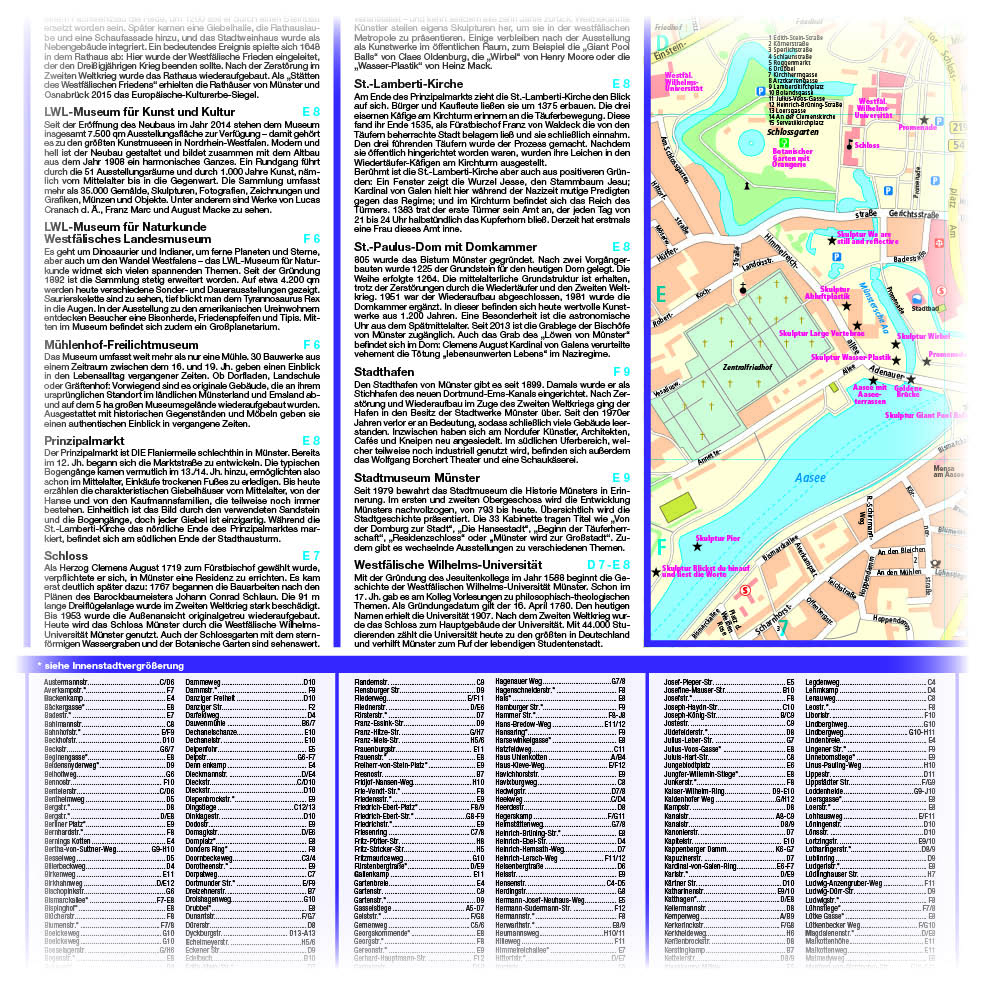 Stadtplan Münster: Stadt der GegensätzeDie junge und doch alte Studentenstadt Münster vereint den Charme der Moderne sowie ihre lange Geschichte zu einem einzigartigen Mix, den man erlebt haben muss. Keine Frage: Die Westfälische Metropole mit ihren zahlreichen Sehenswürdigkeiten ist eine Reise wert. Von der langen Stadtgeschichte und ihrer Entwicklung erzählen die zahlreichen Kirchen, allen voran der Dom, das Historische Rathaus und die Museen. Bei einem Bummel durch die quirligen Gassen und Straßen mit ihren zahlreichen Radfahrern erlebt man das besondere Flair der Universitätsstadt. Der touristische Innenstadtplan enthält alle wichtigen Sehenswürdigkeiten, eine Innenstadtvergrößerung im Maßstab 1:10 000 und ein Straßenverzeichnis zur schnellen Orientierung.