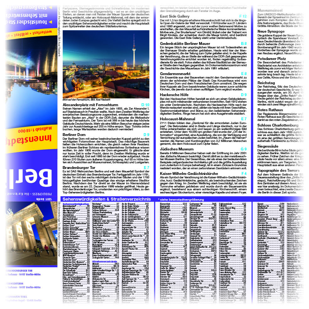 Regierungssitz, Touristenmagnet, Weltmetropole - die deutsche Bundeshauptstadt ist weit mehr als das. Multikulturell vereint Berlin Tradition und Moderne, gespickt mit Sehenswürdigkeiten und Vielfalt. Ein Bummel durch die ehemals geteilte Stadt entlang von Brandenburger Tor, KaDeWE und Alexanderplatz fasziniert und begeistert. Der touristische Innenstadtplan enthält alle wichtigen Sehenswürdigkeiten, eine Innenstadtvergrößerung im Maßstab 1:10 000 und ein Straßenverzeichnis zur schnellen Orientierung.