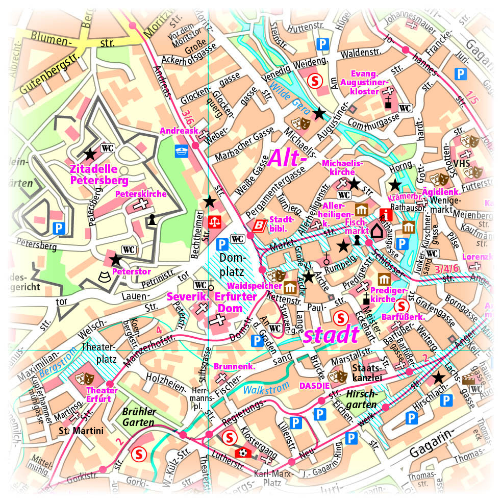 Erfurt "liegt am besten Ort. Da muss eine Stadt stehen", urteilte einst der Reformator Martin Luther. Die Landeshauptstadt Thüringens wird geprägt durch einen der größten und am besten erhaltenen mittelalterlichen Stadtkerne Deutschlands, bestehend aus reichen Patrizierhäusern und liebevoll rekonstruierten Fachwerkhäusern, überragt vom monumentalen Ensemble des Mariendomes und der Severikirche. Erfurt begeistert mit Natur, Kunst und Kultur. Reiche Geschichte, der sehenswerte Altstadtkern und großartige Landschaft prägen das grüne Herz Deutschlands. Bei all Ihren Entdeckungen immer an Ihrer Seite: Der touristische Stadtplan mit Umgebungskarte, Innenstadtvergrößerung, Infos zu den wichtigsten Sehenswürdigkeiten sowie Straßen- und Sehenswürdigkeitenverzeichnis.