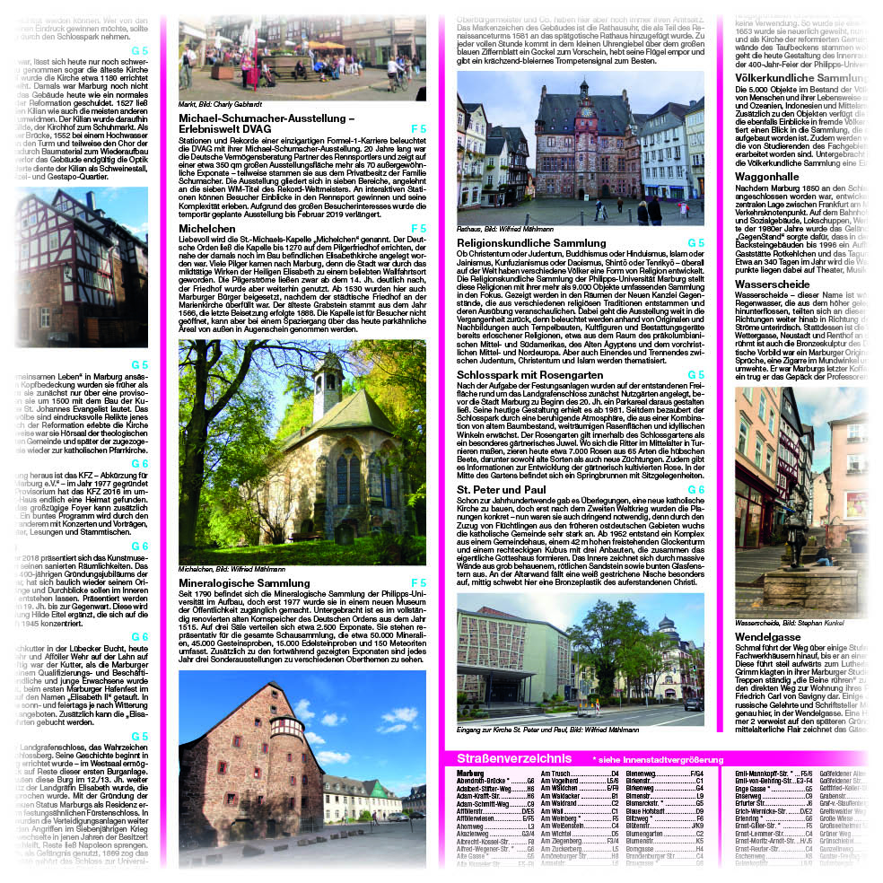 Altehrwürdig und doch jung - dass dies kein Gegensatz sein muss, sondern vielmehr eine reizvolle Mischung, das beweist die Studentenstadt an der Lahn. Wer durch Marburg schlendert, erlebt eine Bilderbuchkulisse mit einer reizvollen historischen Altstadt, die den Zweiten Weltkrieg nahezu unbeschadet überstanden hat, und dem über dem Lahntal thronenden Schloss. Zu den sehenswerten Museen gehören unter anderem das Erste Deutsche Polizei-Oldtimer-Museum, das Kunstmuseum , das Museum Anatomicum oder die Emil-von-Behring-Ausstellung. Ein besonderes Erlebnis ist sicherlich die Fahrt mit der Schlossbahn durch die Altstadt bis auf den Schlossberg. Und wer die Stufen zwischen Ober- und Unterstadt scheut, der nutzt den Oberstadtaufzug. Bei all Ihren Entdeckungen immer an Ihrer Seite: Der touristische Stadtplan mit Umgebungskarte, Innenstadtvergrößerung, Infos zu den wichtigsten Sehenswürdigkeiten sowie Straßen- und Sehenswürdigkeitenverzeichis.