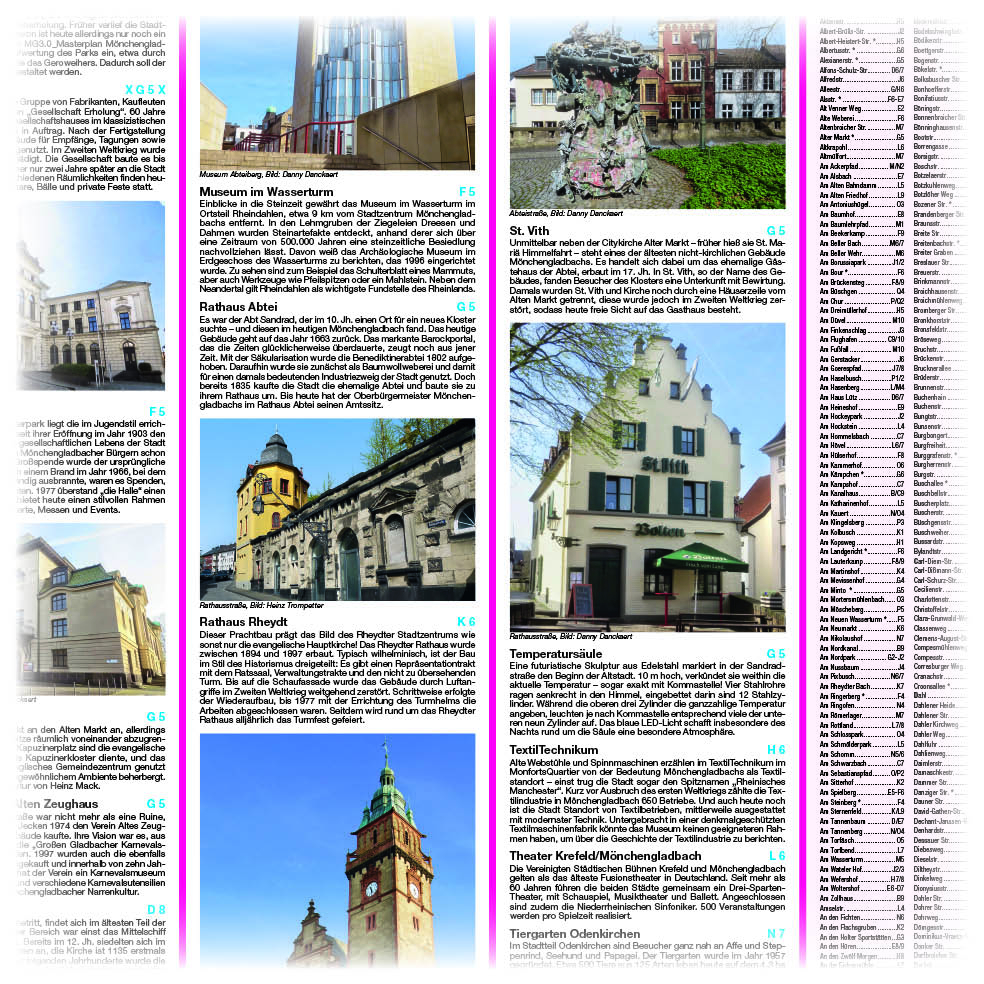 Die größte Metropole am Niederrhein entstand einst aus einer Siedlung am Gladebach. Mönchengladbach, zu recht wegen der zahllosen Grünflächen als "Großstadt im Grünen" bezeichnet, begeistert nicht nur mit ihren Parks, sondern genauso mit ihrer reichhaltigen Kultur, die sich unter anderem im Museum am Abteiberg, im Skulpturengarten und in der Skulpturenmeile offenbart. Der touristische Stadtplan enthält alle wichtigen Sehenswürdigkeiten, einen Übersichtsplan rund um Mönchengladbach im Maßstab 1 : 200 000, eine Innenstadtvergrößerung im Maßstab 1 : 10 000 und ein Straßenverzeichnis zur schnellen Orientierung.