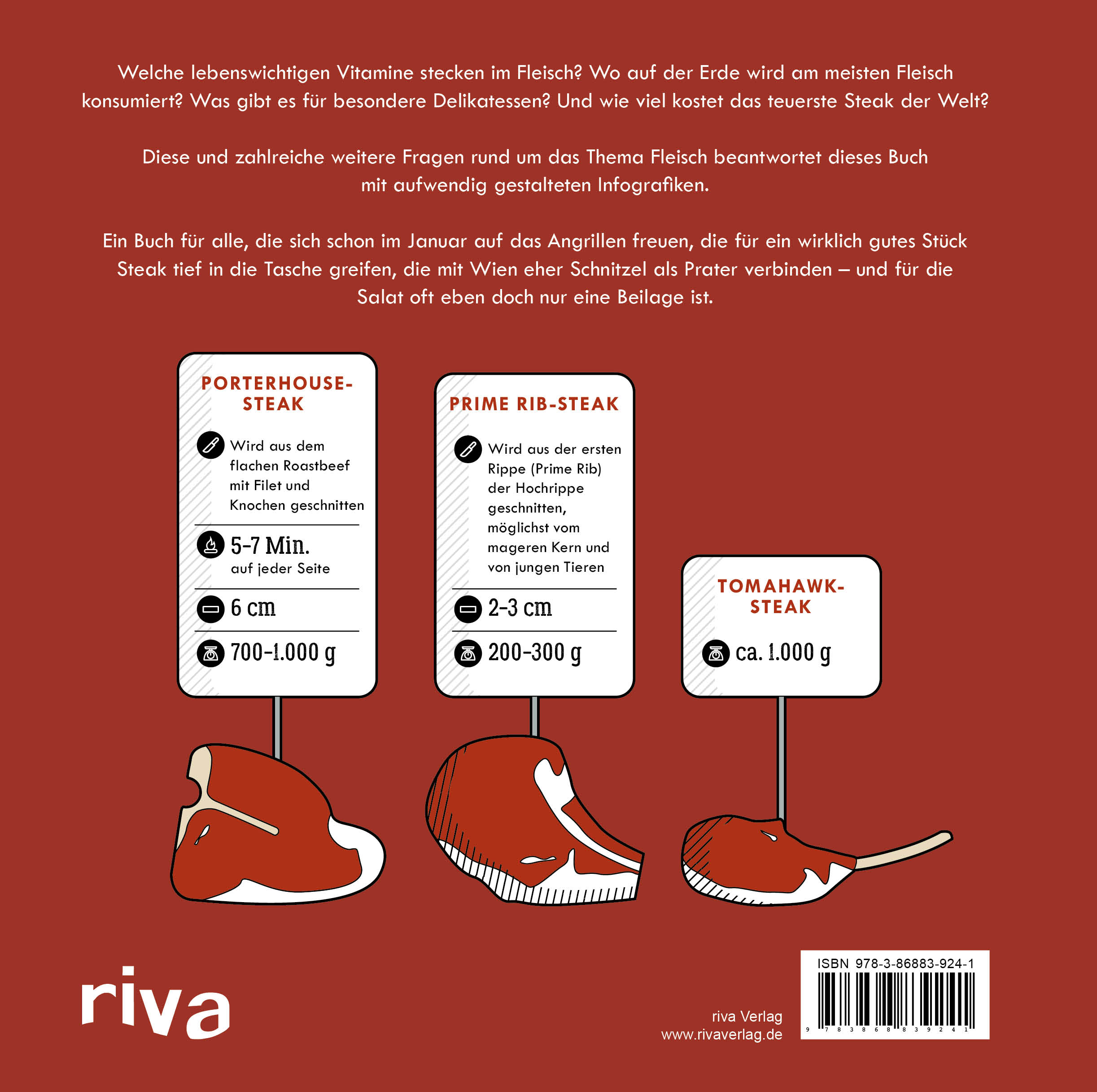 Welche lebenswichtigen Vitamine stecken im Fleisch? Wo auf der Erde wird am meisten Fleisch konsumiert? Was gibt es für besondere Delikatessen? Und wie viel kostet das teuerste Steak der Welt?Diese und zahlreiche weitere Fragen rund um das Thema Fleisch beantwortet dieses Buch mit aufwendig gestalteten Infografiken.Ein Buch für alle, die sich schon im Januar auf das Angrillen freuen, die für ein wirklich gutes Stück Steak tief in die Tasche greifen, die mit Wien eher Schnitzel als Prater verbinden - und für die Salat oft eben doch nur eine Beilage ist.