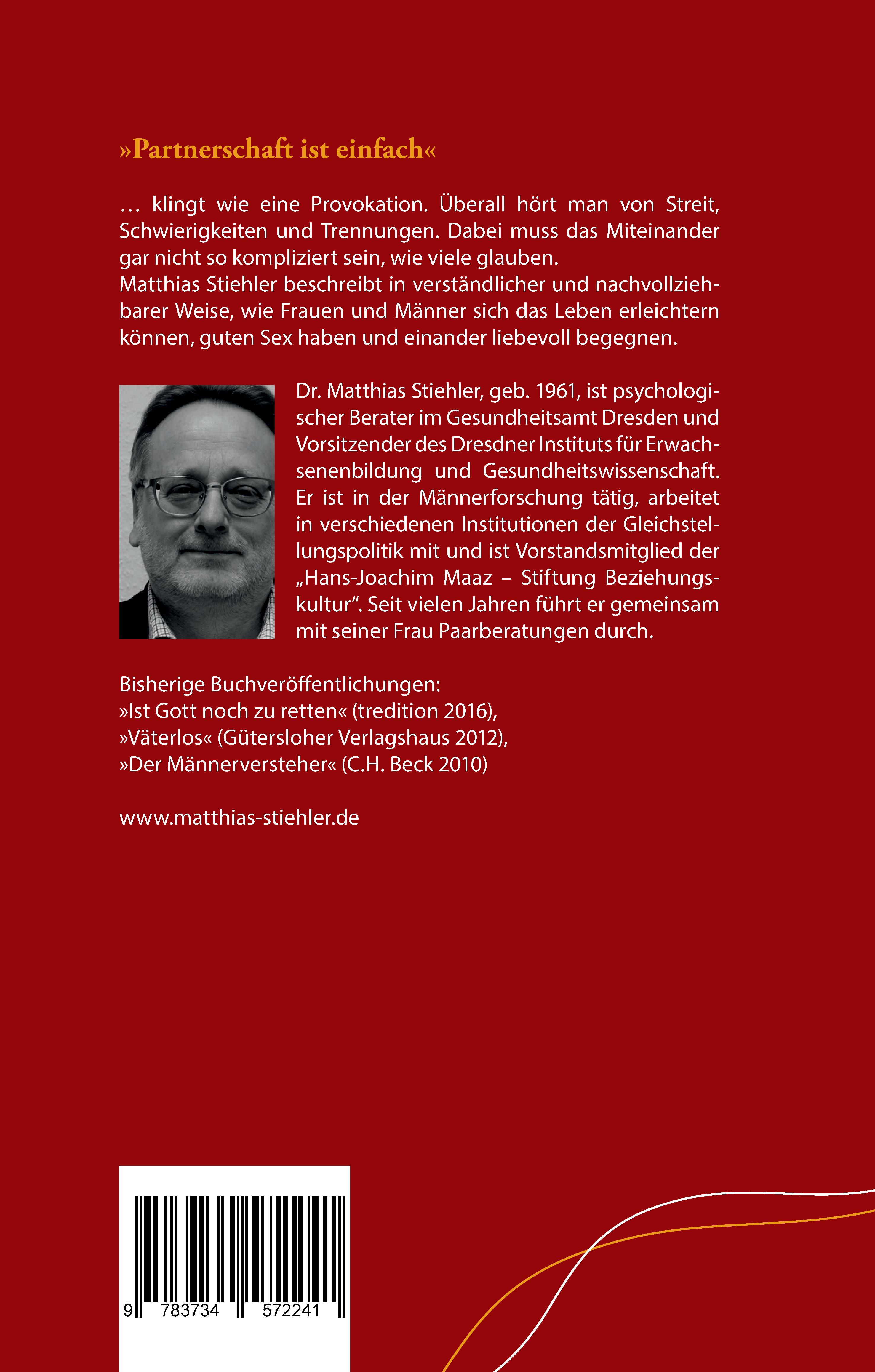 »Partnerschaft ist einfach« klingt wie eine Provokation. Überall hört man von Streit, Schwierigkeiten und Trennungen. Dabei muss das Miteinander gar nicht so kompliziert sein, wie viele glauben.Matthias Stiehler beschreibt in verständlicher und nachvollziehbarer Weise, wie Frauen und Männer sich das Leben erleichtern können, guten Sex haben und einander liebevoll begegnen.