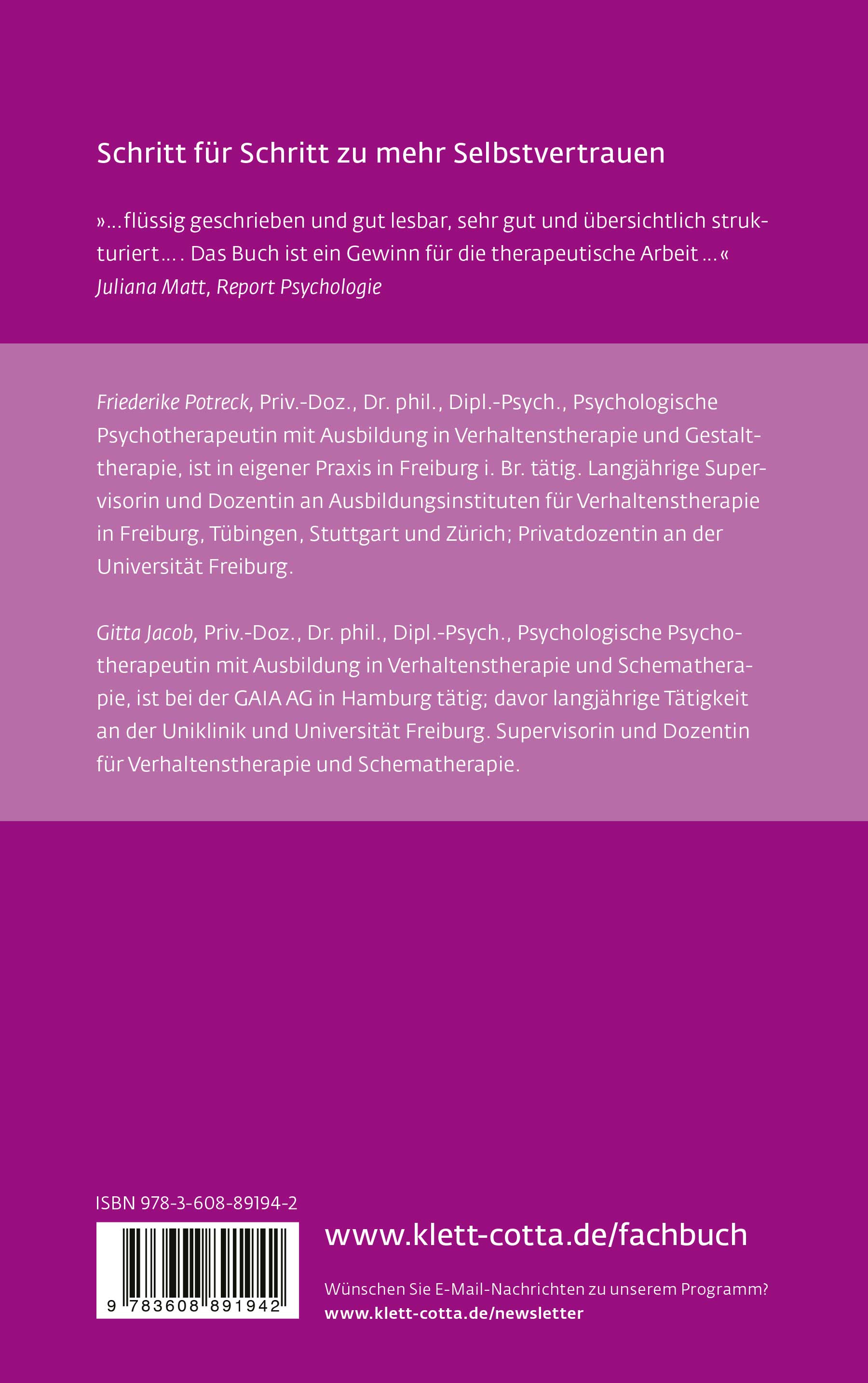 »... ergibt sich eine gut lesbare Gesamtdarstellung zum Thema, die einen guten Überblick verschafft, zahlreiche Übungen zur Verbesserung verschiedener Aspekte des Selbstwertes darstellt und gleichzeitig flexible Einsatzmöglichkeiten für Fachpersonal unterschiedlichster Therapieschulen und therapeutischer Richtungen anbietet.« Kirsten Oleimeulen, socialnet.de, 28.07.2014 Kirsten Oleimeulen socialnet.de 20140728