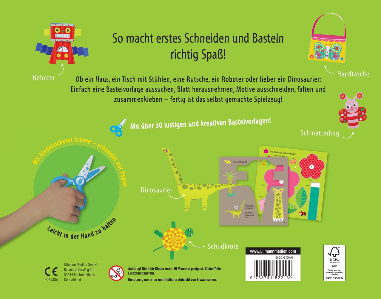Basteln lieben schon die Kleinsten! Mit diesem Bilderbuch lernen Kinder ab drei Jahren spielend leicht den Umgang mit Schere, Kleber und Papier. Über 30 einfache und liebevoll illustrierte Ausschneide- und Bastelübungen fördern nicht nur Feinmotorik, Konzentration, Denkleistung und Kreativität, sondern bringen auch jede Menge Bastelspaß. Die beiliegende kindersichere Schere aus Kunststoff schneidet nur Papier und eignet sich perfekt für erste Schneideübungen. Damit steht den angehenden kleinen Künstlern nichts mehr im Wege.