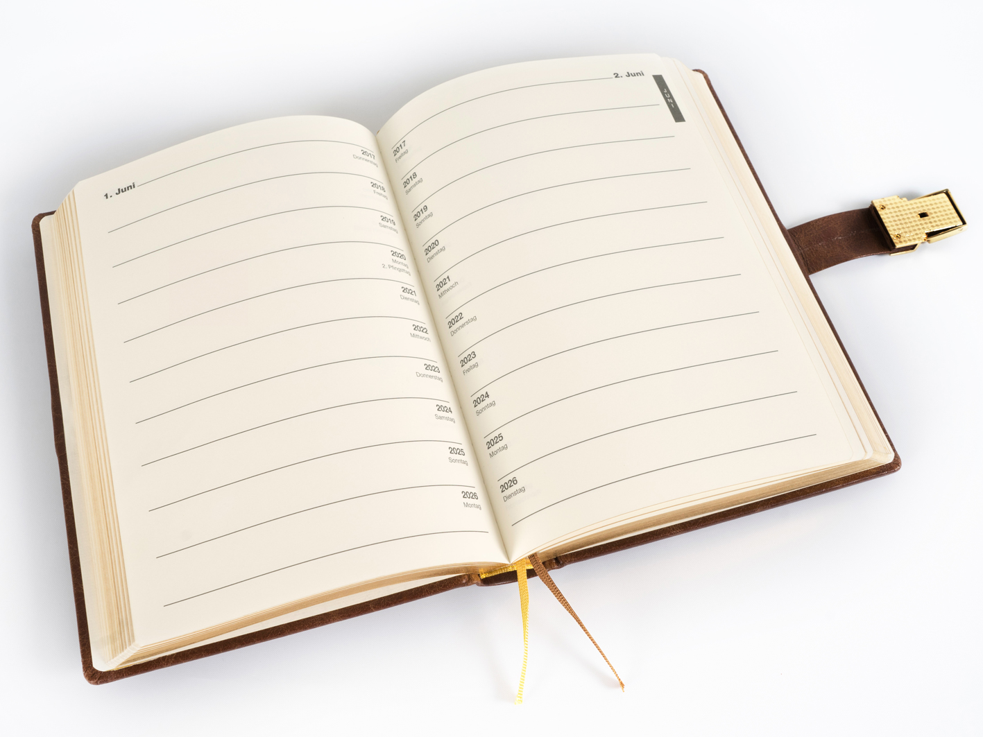 Kalenderbuch der Jahre 2017-2026 mit eingedrucken Wochen- und Feiertagen. Hochwertig gebunden in wattiertem Rinderoberleder in cross-mokka mit Schließe.