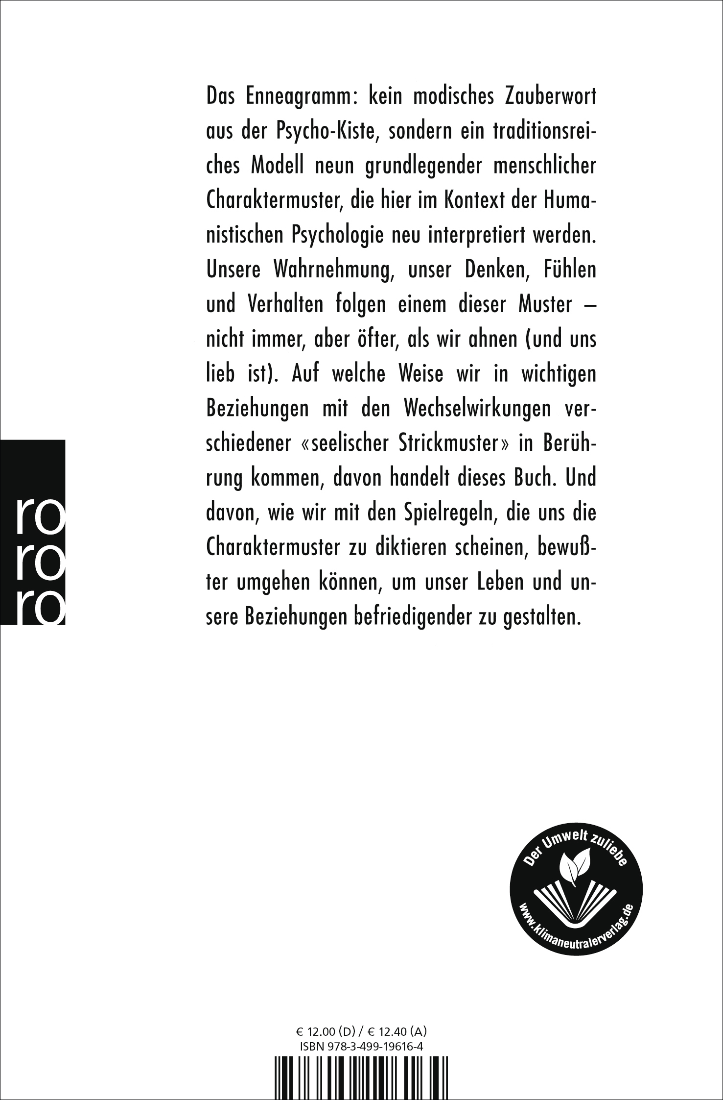 lt;p>Das Enneagramm: kein modisches Zauberwort aus der Psycho-Kiste, sondern ein traditionsreiches Modell neun grundlegender menschlicher Charaktermuster, die hier im Kontext der Humanistischen Psychologie neu interpretiert werden. Unsere Wahrnehmung, unser Denken, Fühlen und Verhalten folgen einem dieser Muster - nicht immer, aber öfter, als wir ahnen (und uns lieb ist). Auf welche Weise wir in wichtigen Beziehungen mit den Wechselwirkungen verschiedener "seelischer Strickmuster" in Berührung kommen, davon handelt dieses Buch. Und davon, wie wir mit den Spielregeln, die uns die Charaktermuster zu diktieren scheinen, bewusster umgehen können, um unser Leben und unsere Beziehungen befriedigender zu gestalten.