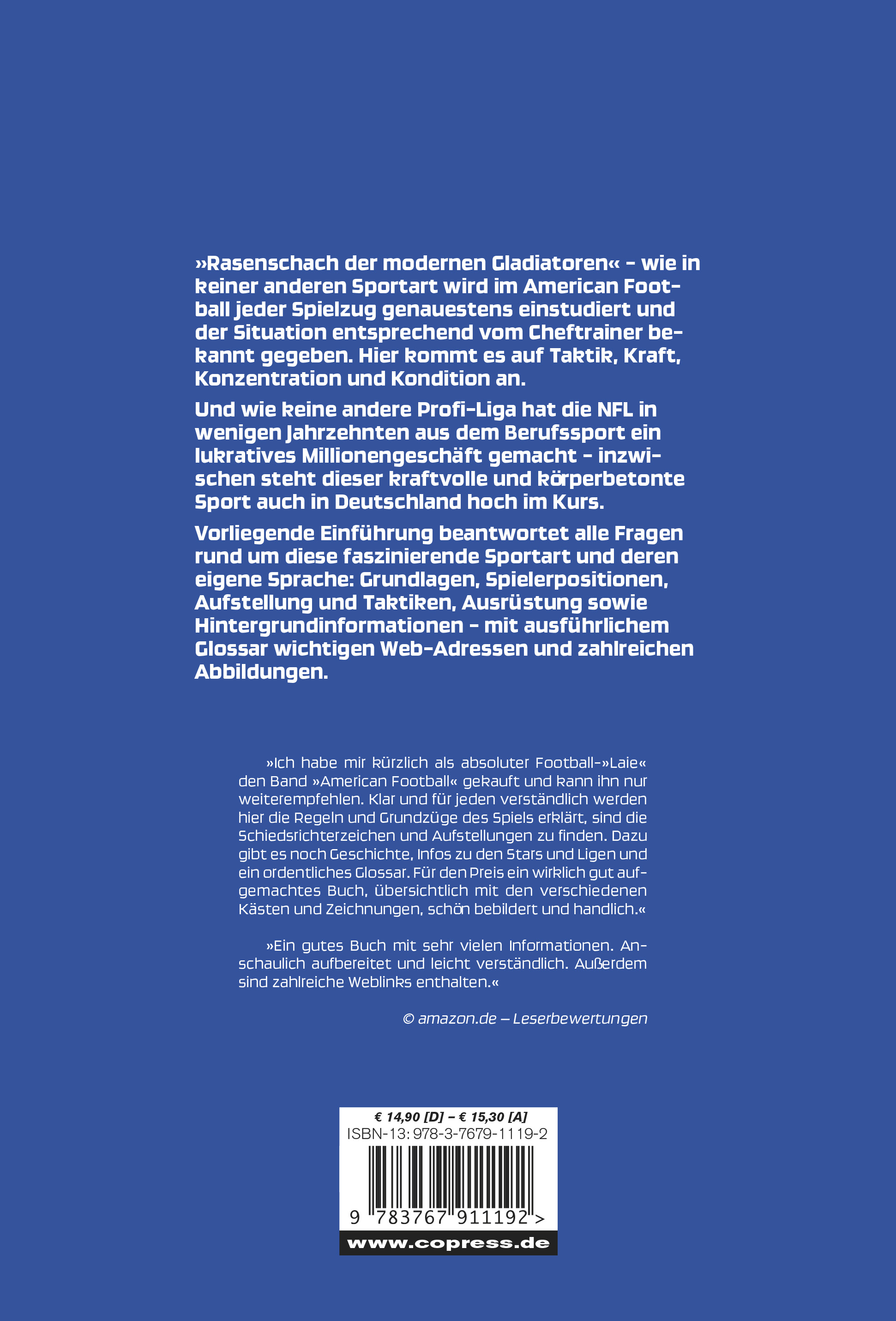 Schnell, taktisch und brutal: American Football erobert zunehmend auch die Herzen der deutschen Sportfans. Wie in kaum einer anderen Sportart wird im Football jeder Spielzug genauestens einstudiert und vom »Coach« an die Spieler über geheime Zeichen kommuniziert. Es kommt bei diesem Teamsport nicht nur auf Kondition und Technik an, sondern auch auf Taktik, Konzentration und natürlich nicht zuletzt Kraft.
