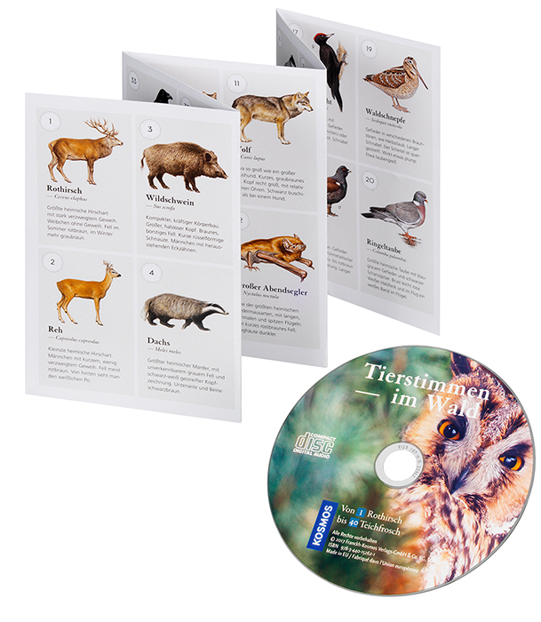 Ob Hirsch und Reh, Wildschwein oder scheue Vögel: Viele Tiere des Waldes hört man viel eher, als dass man sie sieht. Mit der CD in diesem Package kann man sich zu Hause die häufigsten Tierstimmen des Lebensraums Wald in Ruhe anhören und so die Tiere, die man gehört hat, bestimmen. Die wichtigsten Informationen zu den Tieren finden sich im Leporello in Bild und Text. Wer sich die Tierstimmen unterwegs anhören möchte, kann dies per Smartphone oder Tablet mit der kostenlosen KOSMOS-PLUS-App.