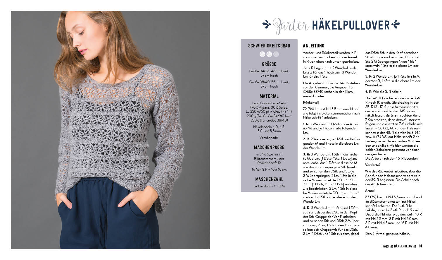 So hauchzart und wunderschön kann Häkelmode sein! Häkeln Sie über 20 traumhafte Modelle mit filigranen Lochmustern aus edlen Lace-Garnen. Ob zartes Stirnband, luftige Oberteile, Mützen oder feine Tücher - diese federleichten Häkelprojekte aus speziellen Lace-Garnen begeistern Fans zarter Häkelmode und feiner Accessoires. Auch für Häkel-Einsteiger mit Grundkenntnissen geeignet.