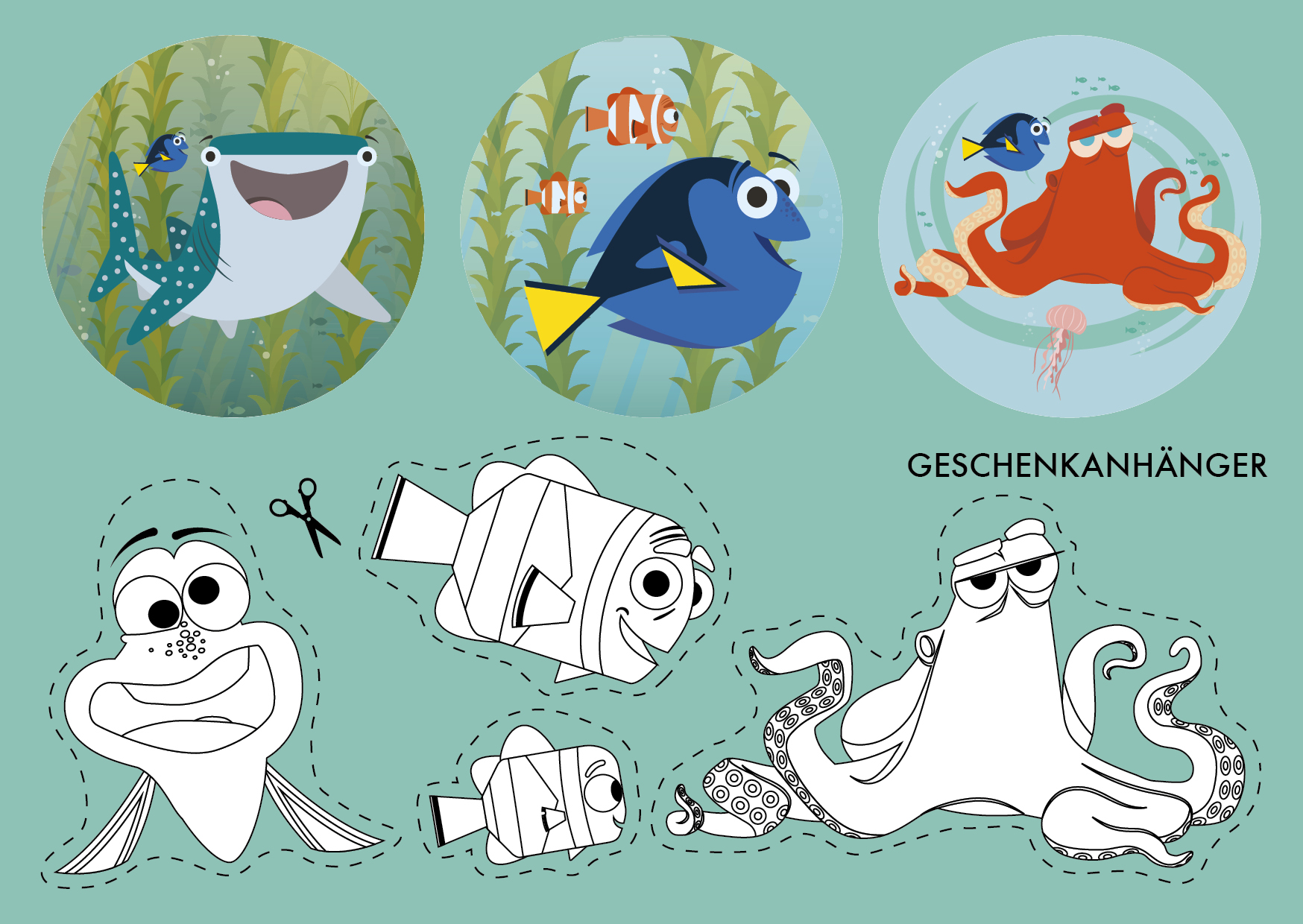 - Ausmalpostkarten, Lesezeichen, Geschenkanhänger, Fingerfiguren und vieles mehr rund um Dories Unterwasserwelt