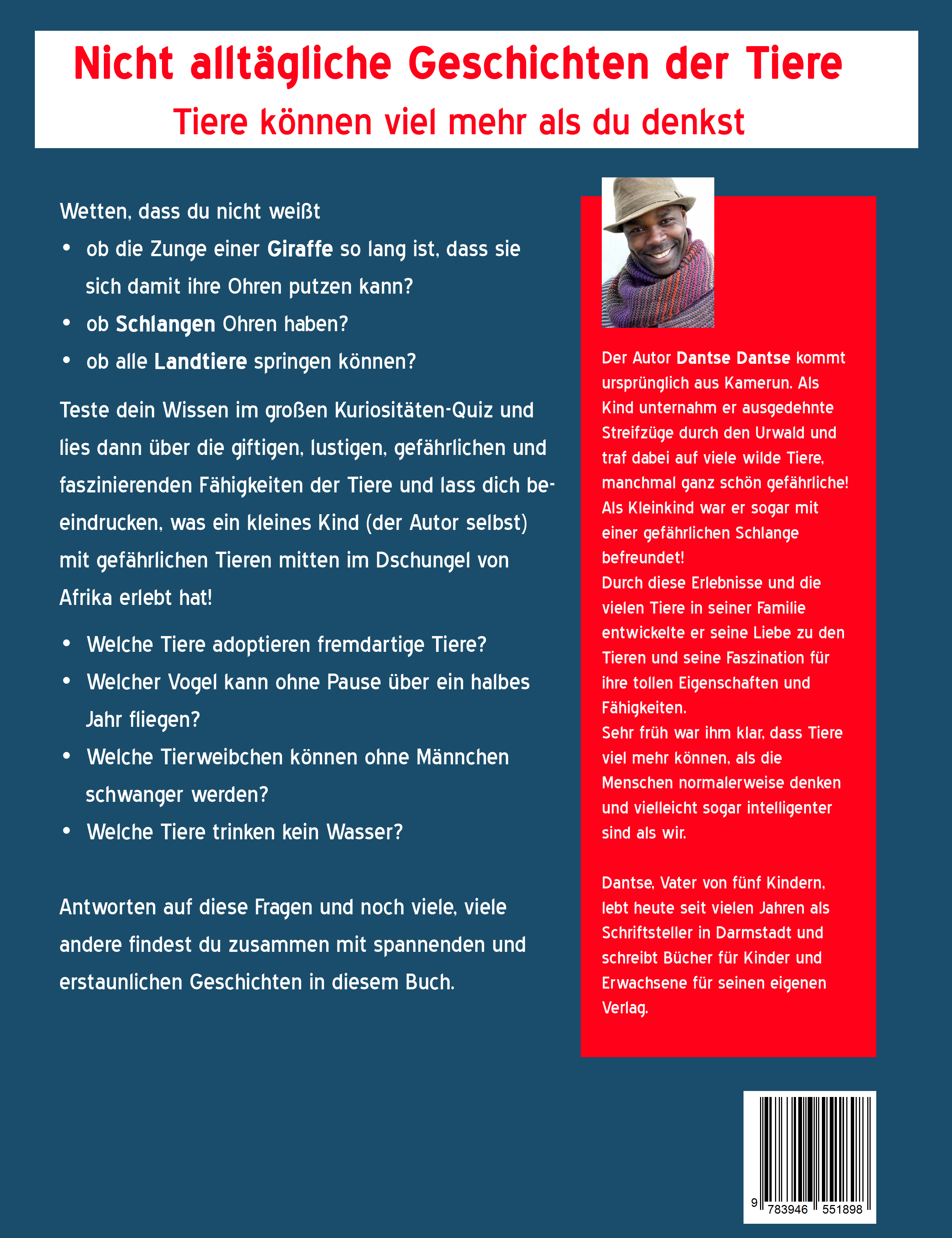 Teste dein Wissen im großen Kuriositäten-Quiz und lies dann über die giftigen, lustigen, gefährlichen und faszinierenden Fähigkeiten der Tiere und lass dich beindrucken, was ein kleines Kind (der Autor selbst) mit gefährlichen Tieren mitten im Dschungel von Afrika erlebt hat!Kann eine Schlange einen Menschen jagen?Können eine Schlange und eine Ratte Freunde sein?Wie atmen Tiere unter Wasser?Gibt es Tiere, die nie schlafen?Welches ist das giftigste Tier?Können Tiere Ärzte, Architekten, Richter, Mathematiker und Handwerker sein?Welche Tiere fressen Menschen und trinken Blut?Welches Tier lebt, obwohl der Kopf ab ist?Welche Tiere adoptieren fremdartige Tiere?Welcher Vogel kann ohne Pause über ein halbes Jahr fliegen?Welche Tierweibchen können ohne Männchen schwanger werden?Welche Tiere trinken kein Wasser? Antworten auf diese Fragen und noch viele, viele andere findest du zusammen mit spannenden und erstaunlichen Geschichten in diesem Buch.