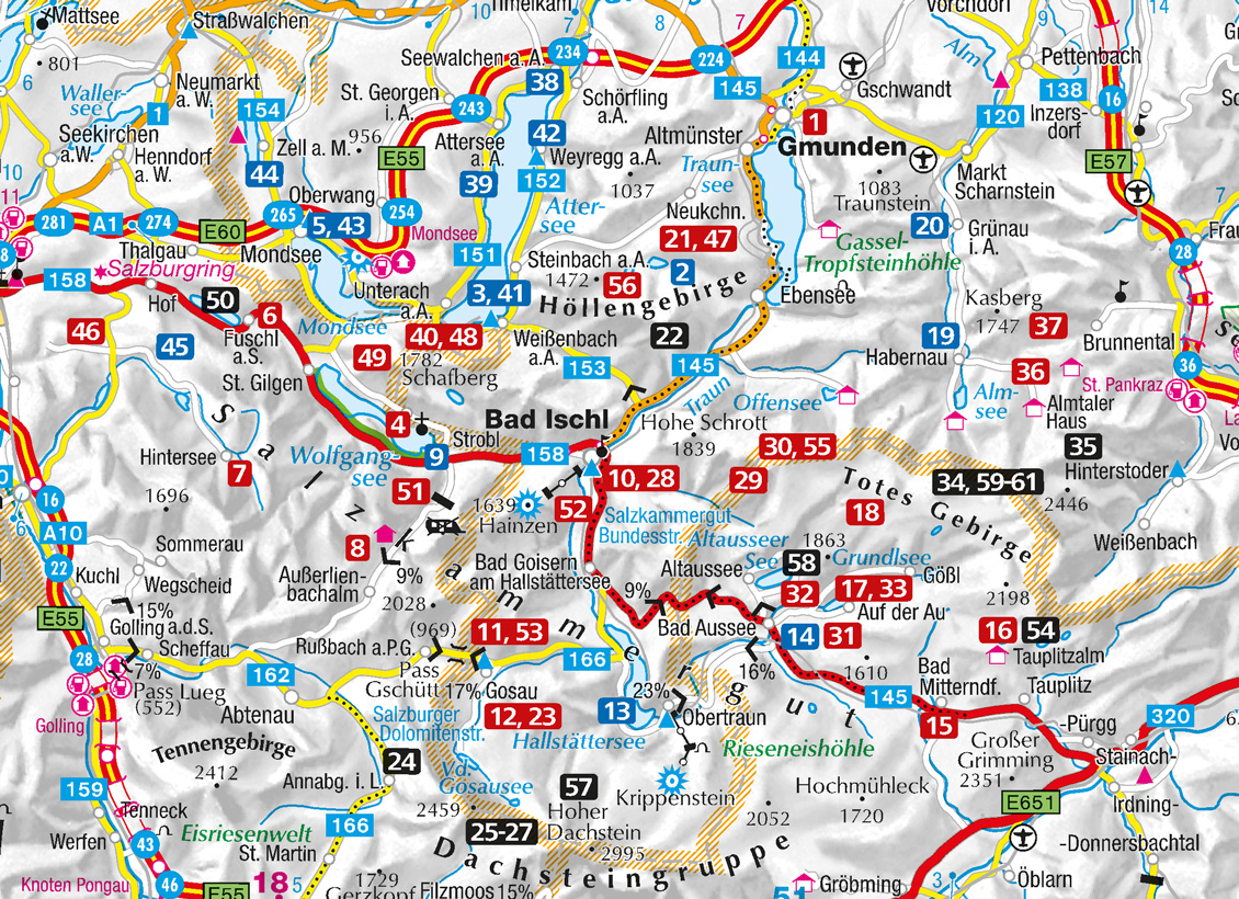 - Anspruchsvollere alpine Varianten führen übers Höllengebirge, zum Dachsteingletscher und durch das Tote Gebirge. Rundtouren um Attersee, Irrsee und die Strubklamm sowie Aussichtsgipfel runden das Angebot ab.