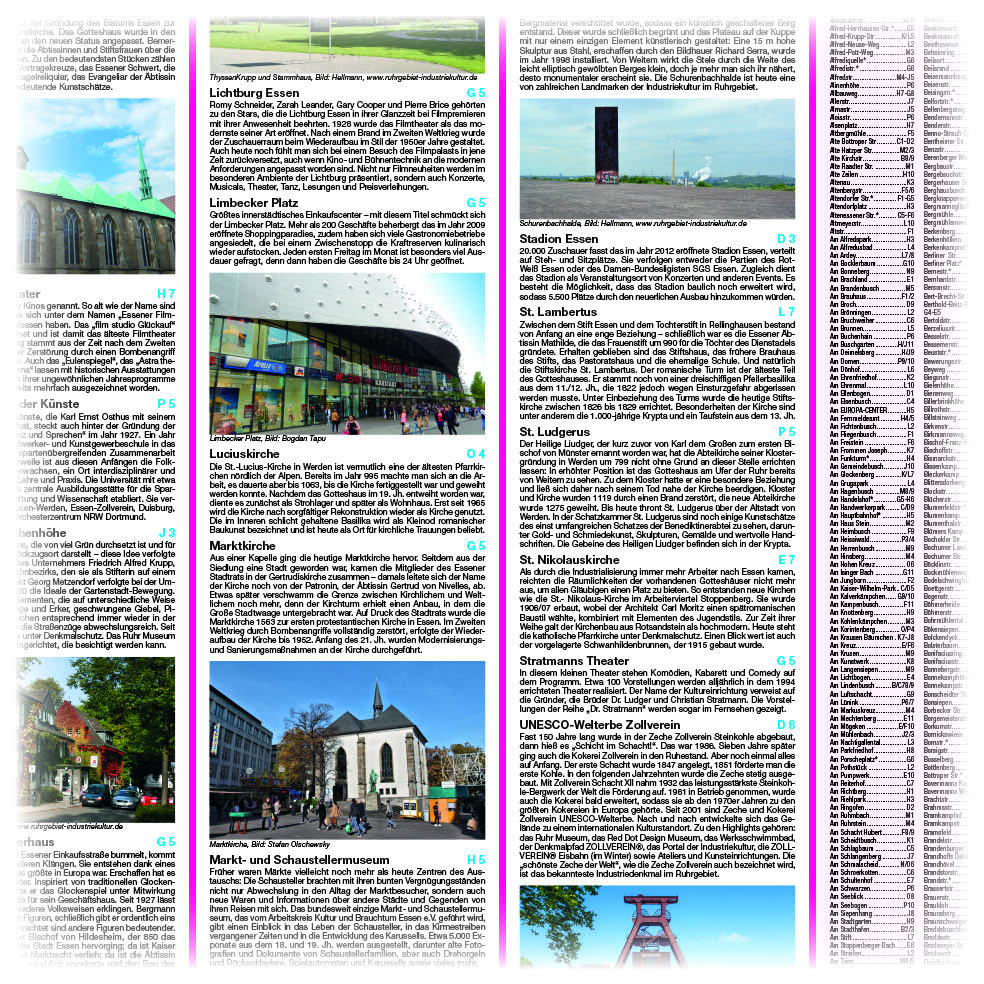 Der touristische Stadtplan enthält alle wichtigen Sehenswürdigkeiten, einen Übersichtsplan rund um Essen im Maßstab 1 : 200 000, eine Innenstadtvergrößerung im Maßstab 1:10 000 und ein Straßenverzeichnis zur schnellen Orientierung.