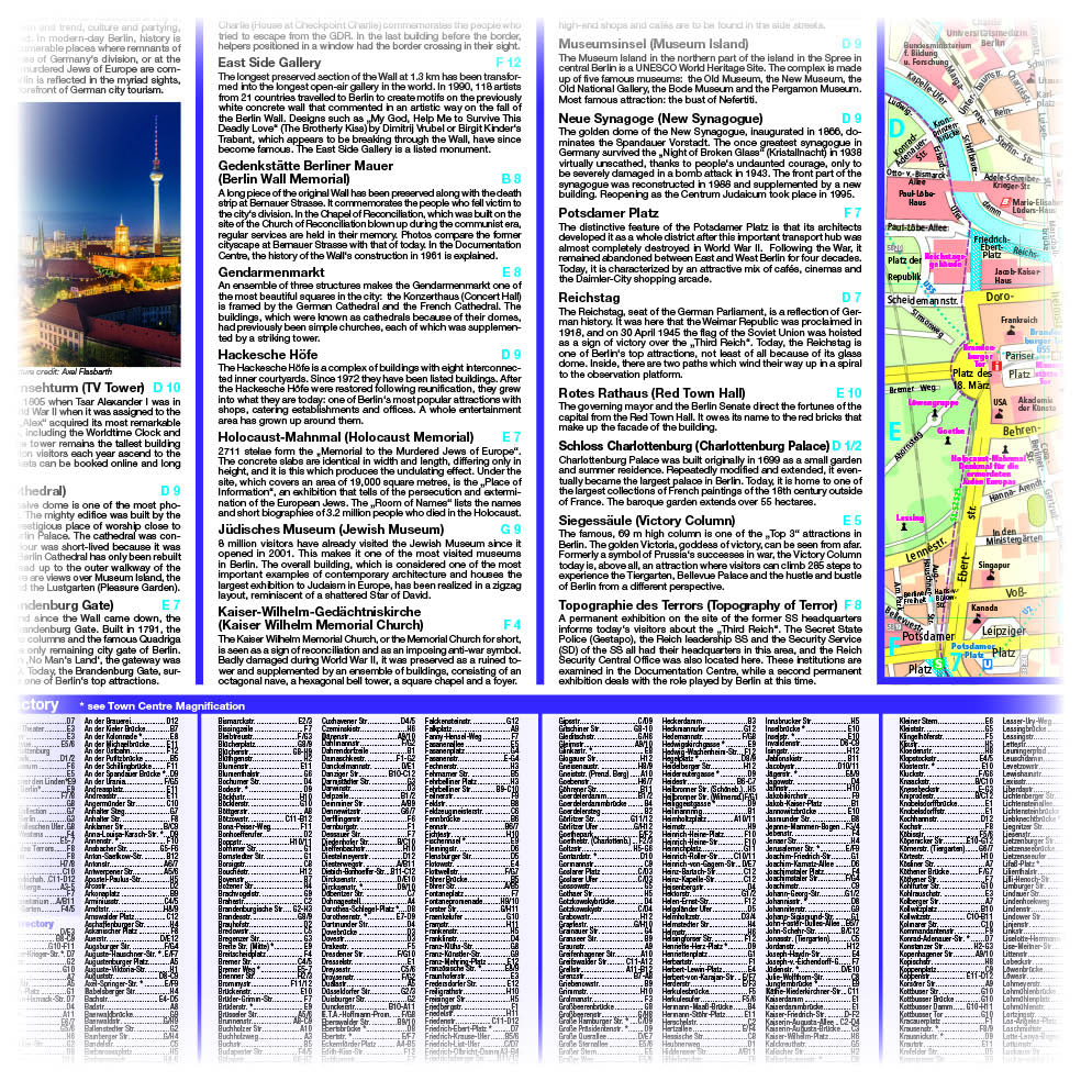 Seat of government. Tourist magnet. Global metropolis. The German capital is all this and much more. Berlin combines tradition and trend, culture and partying, starred gastronomy and fast food. In modern-day Berlin, history is omnipresent - whether in the innumerable places where remnants of the wall lead us to discover traces of Germany's division, or at the Holocaust Memorial, where the murdered Jews of Europe are commemorated. The diversity of Berlin puts the capital in the very forefront of German city tourism. The tourist city map contains descriptions of important sights, a city center map with a scale of 1 : 10.000 and a street index for fast orientation.