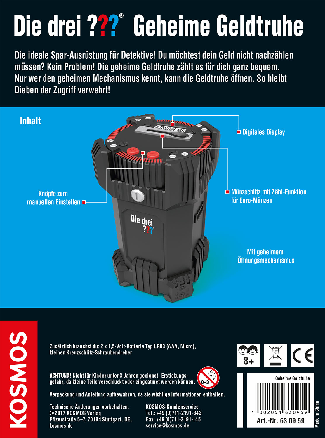 Spardose mit Euro-Münzzählfunktion. In dieser Geldtruhe ist das Ersparte der „Die drei ???“-Fans sicher verwahrt. Nur über einen geheimen Mechanismus kann sie geöffnet werden. Dank der Euro-Münzzählfunktion kann man gleich sehen, ob schon genug Geld für einen geheimen Wunsch angespart ist. Ab 8 Jahren.