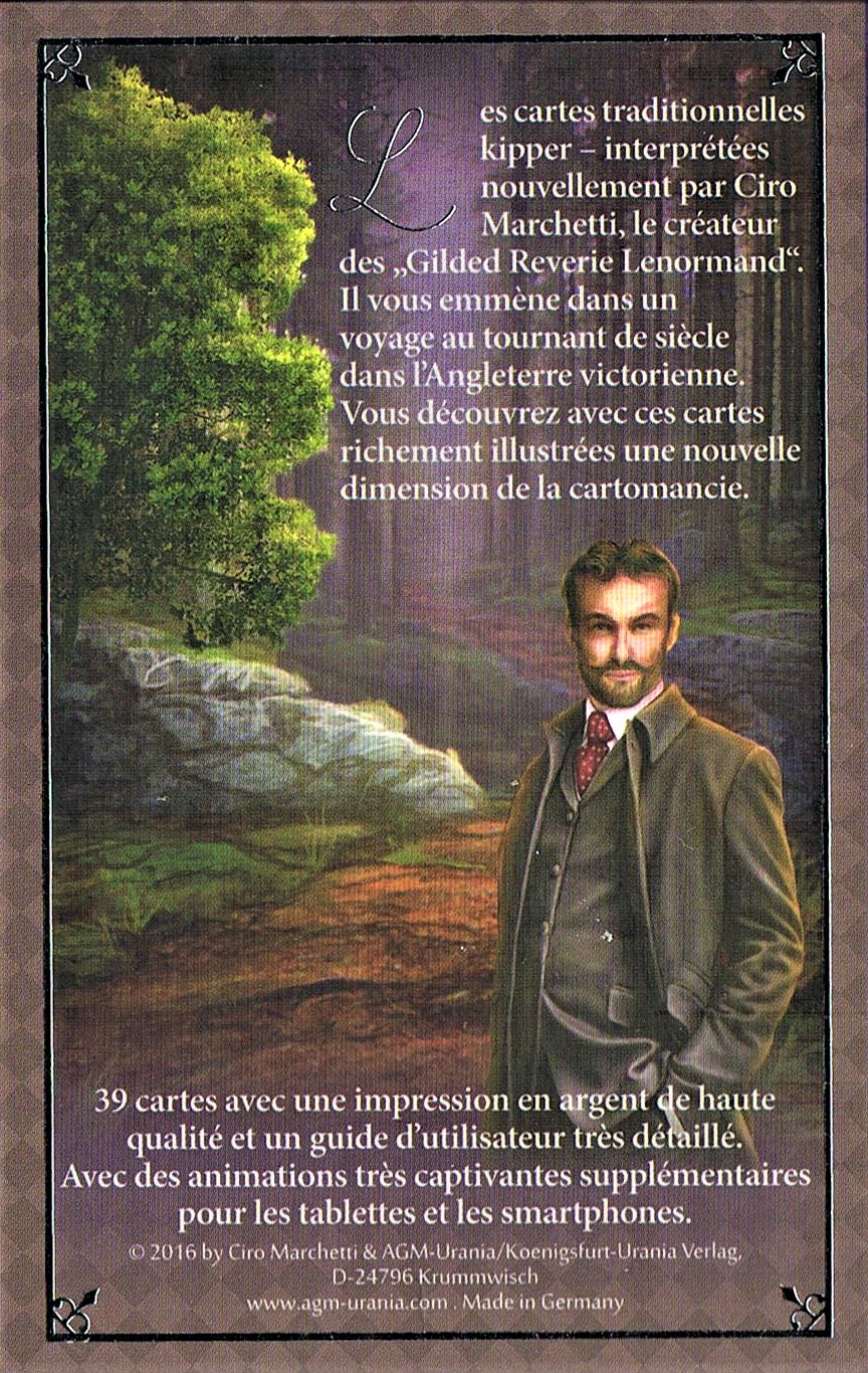 Les cartes traditionnelles kipper – interprétées nouvellement par Ciro Marchetti, le créateur des „Gilded Reverie Lenormand“. Il vous emmène dans un voyage au tournant de siècle dans l’Angleterre victorienne. Vous découvrez avec ces cartes richement illustrées une nouvelle dimension de la cartomancie. 39 cartes avec une impression en argent de haute qualité et un guide d’utilisateur très détaillé. Avec des animations très captivantes supplémentaires pour les tablettes et les smartphones.